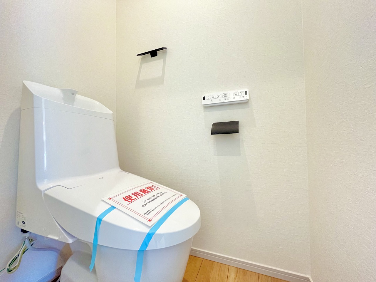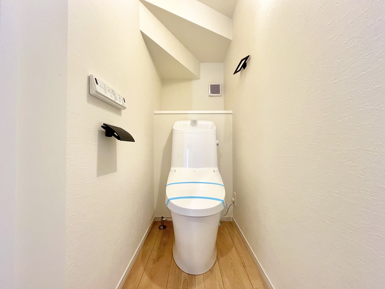 ウォシュレット機能付きのトイレ。収納もあり実用性も兼ね備えた造り。
