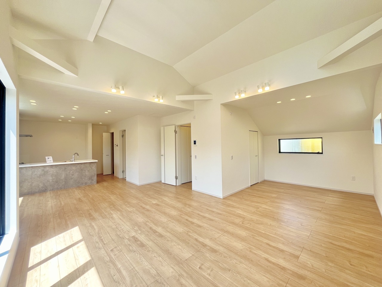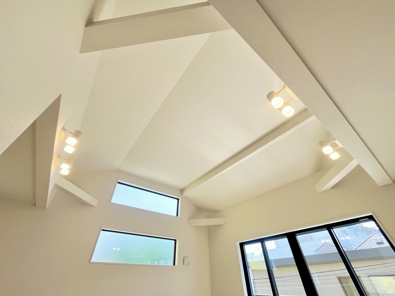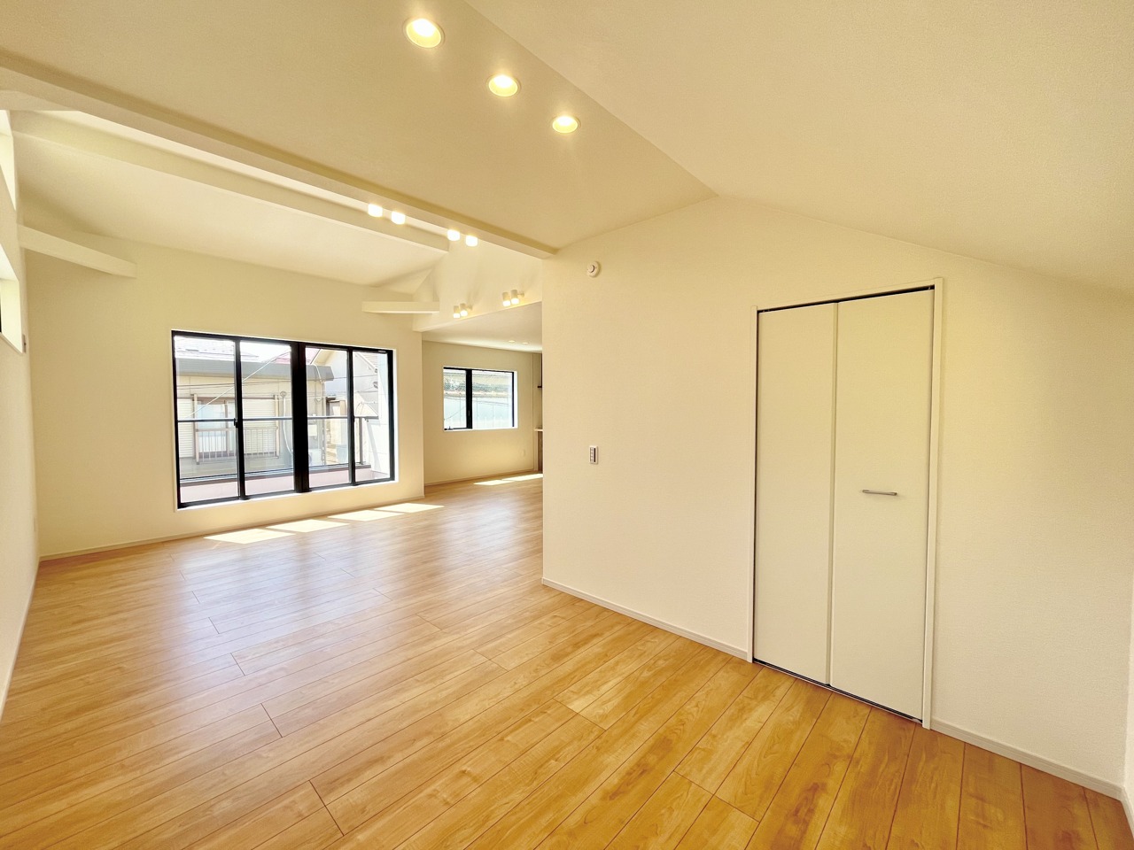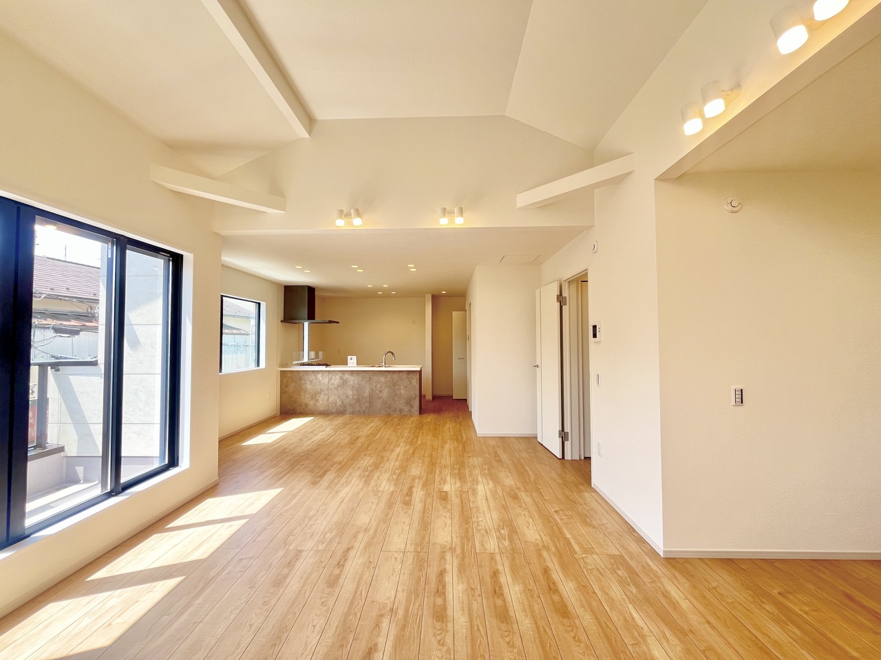 大きな開口部から明るい光が差し込む、日中の室内の明るさがこの部屋の魅力です。