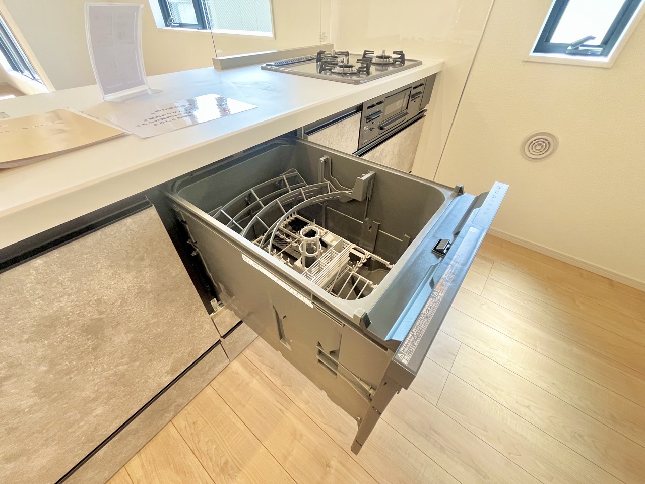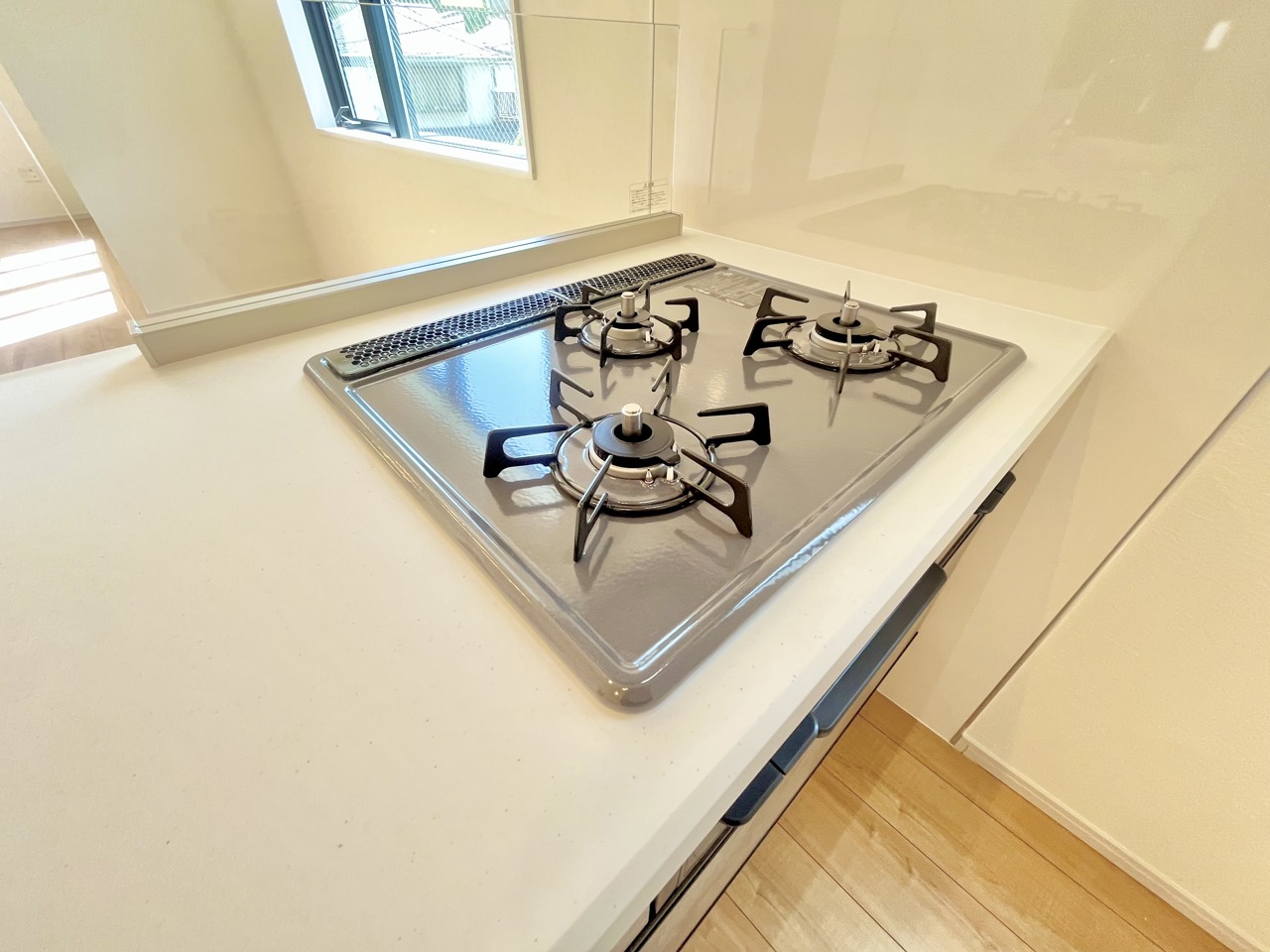 リビングにいる家族の顔が見渡せるカウンターキッチン。お料理もより一層おいしく、楽しく。食器棚を背面に設置しても十分な広さを確保しています。