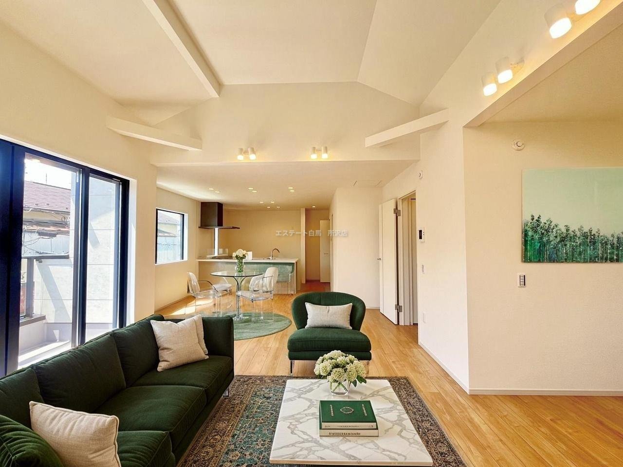 家族や友人、両親、親戚とこれから沢山の時間を紡ぐのだろう。そこを彩るのは窓から見える青い空、心地よい緑。そんなイメージが膨らむリビングスペース。