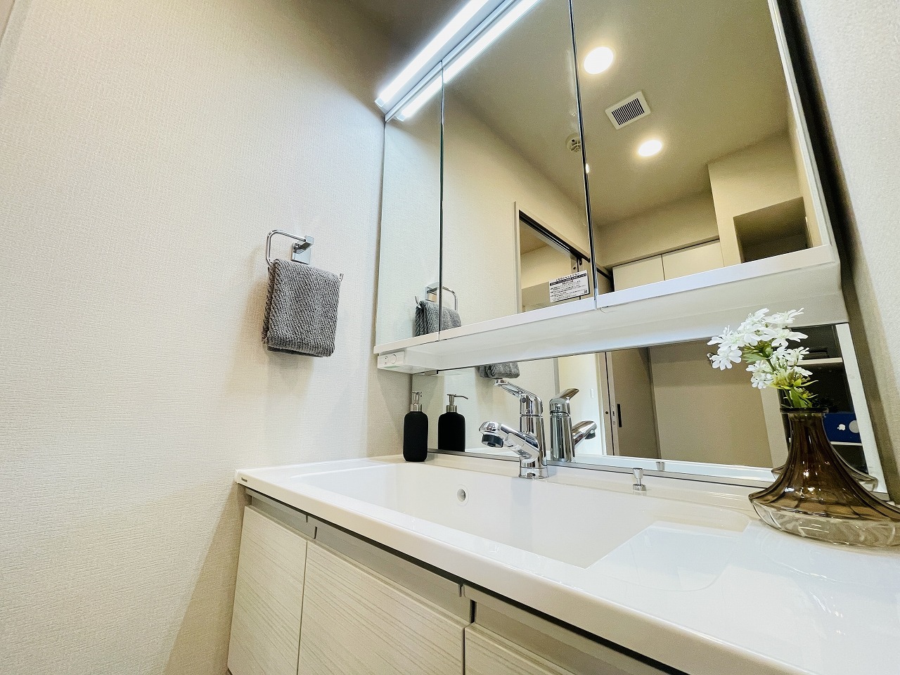 三面鏡に洗面台。 コンセントに照明機能、多機能性を備えた設備です。