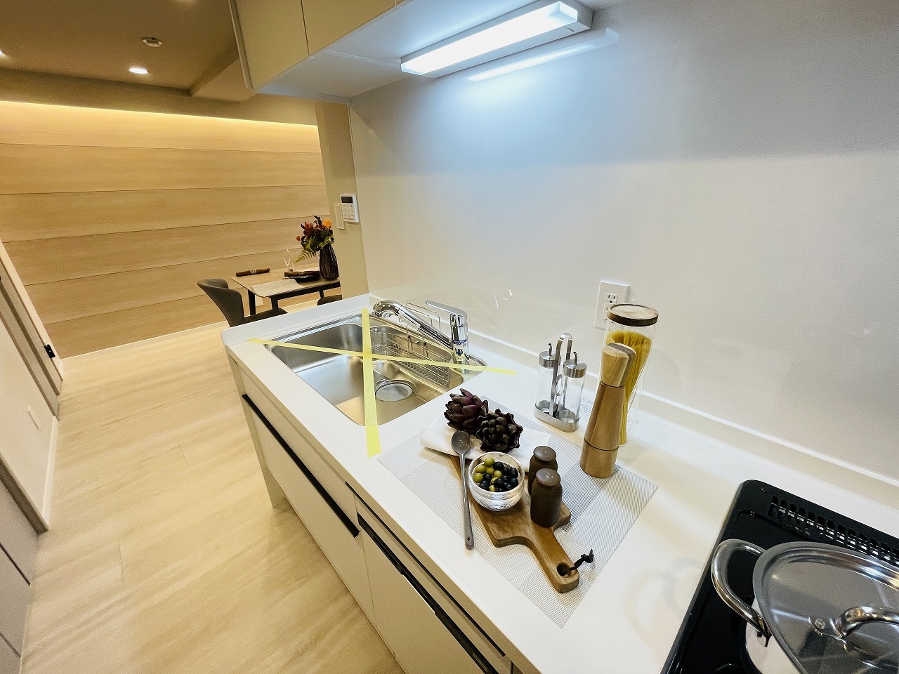 お料理をしながらリビングの家族やゲストとの会話が楽しめるタイプのキッチン。毎日のお料理を楽しく快適に。
