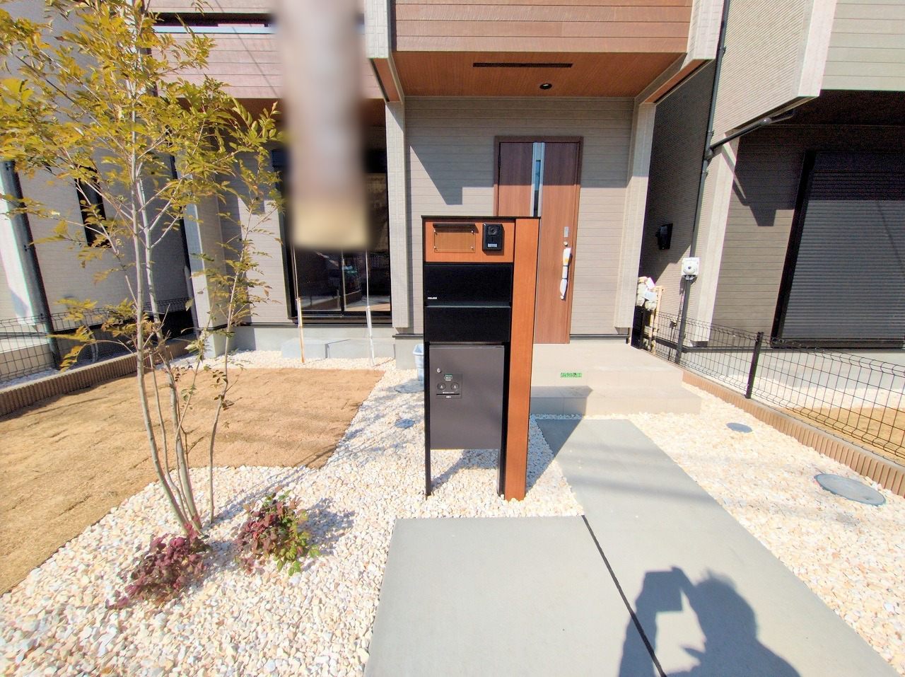 ポスト、表札、インターホンを兼ねる機能門柱。シンプルな外観で容量のあるポストです。