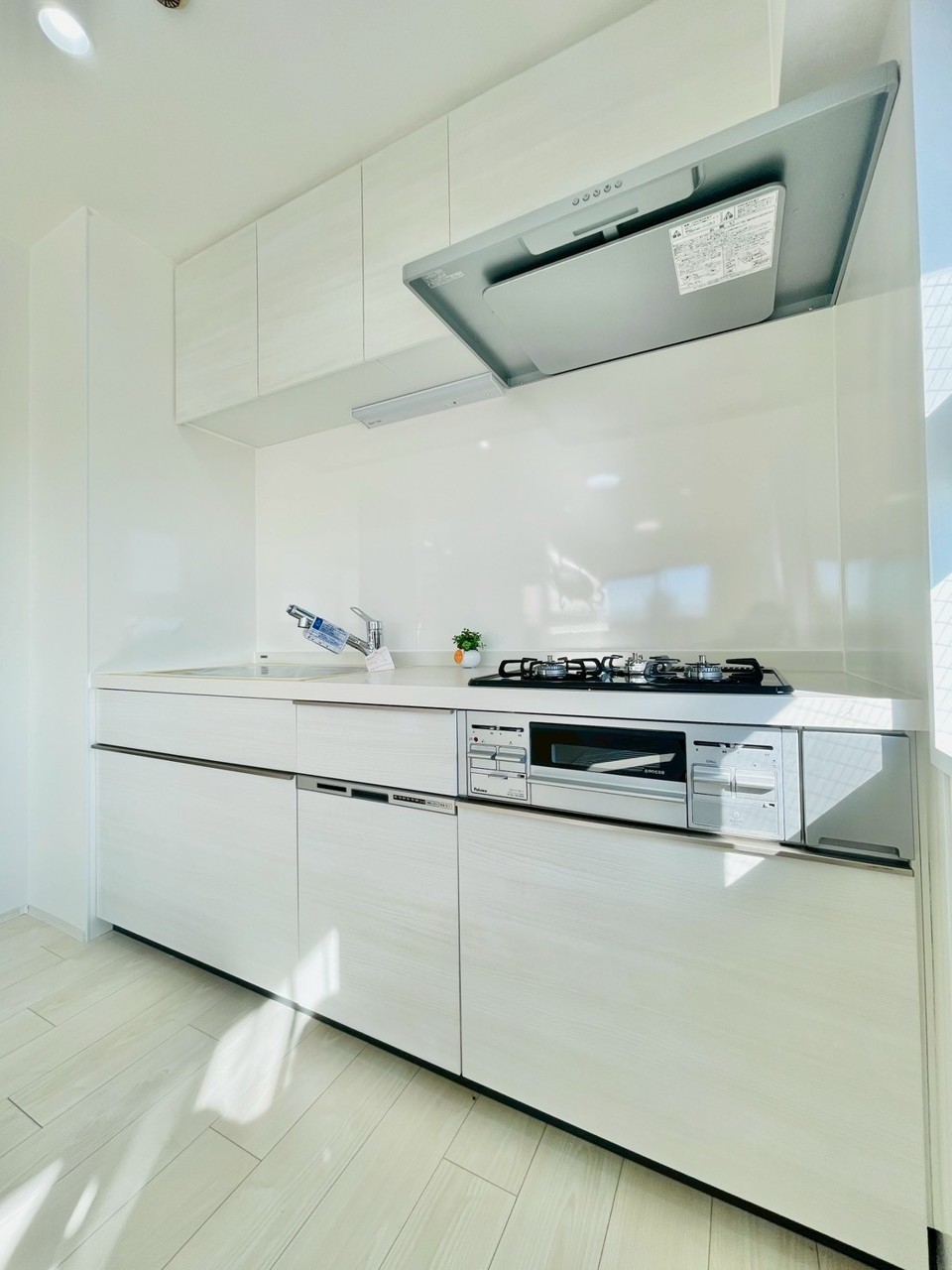 手を伸ばせばそこに収納が。安定した使用感の吊戸棚つきのキッチン空間。