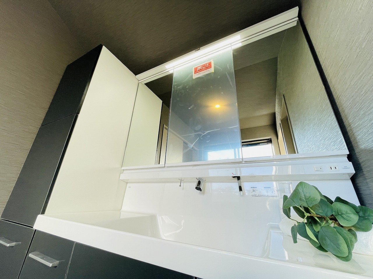 三面鏡に洗面台。 コンセントに照明機能、多機能性を備えた設備です。