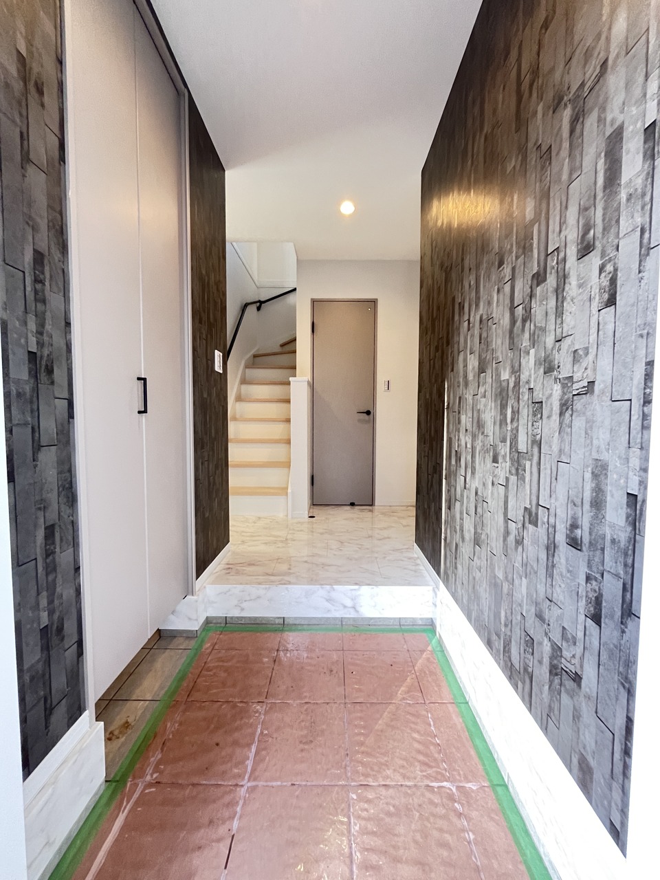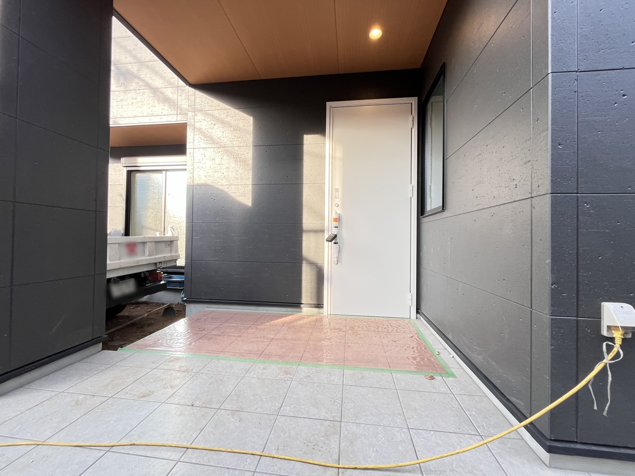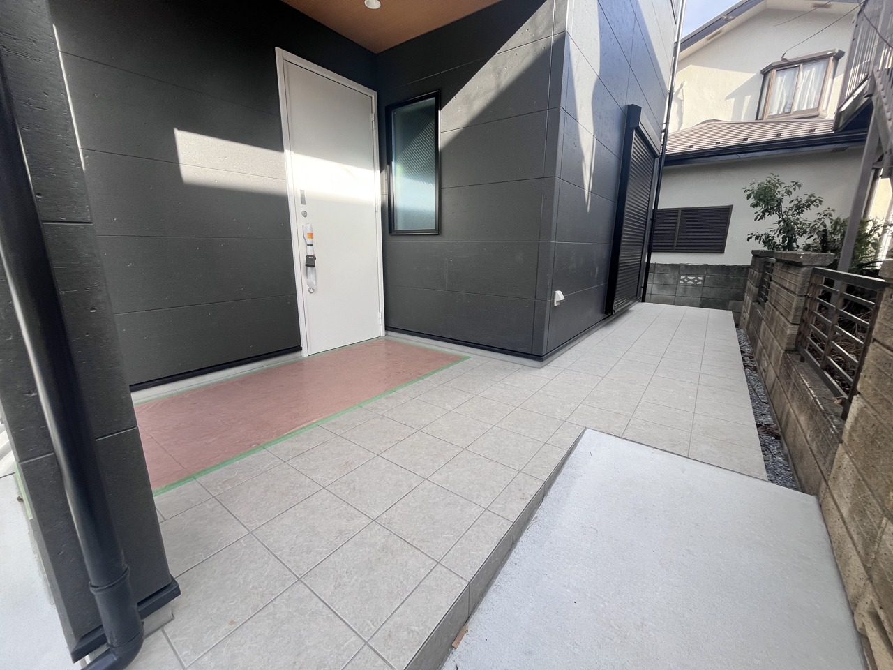 玄関は広いアルコープの為、雨や雪でも濡れずに玄関内に入れます。自転車やバギー、宅配の荷物も置けて便利です。