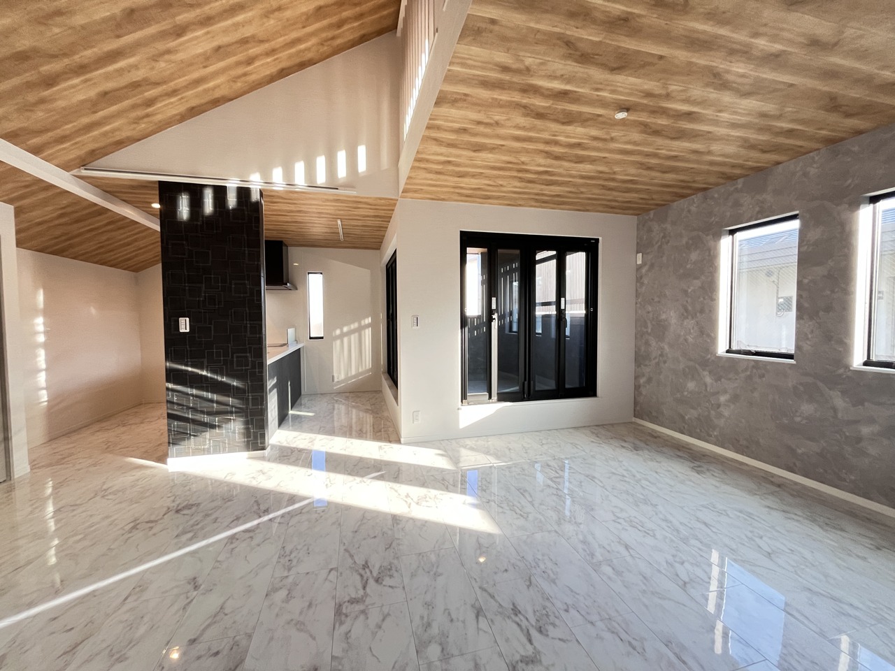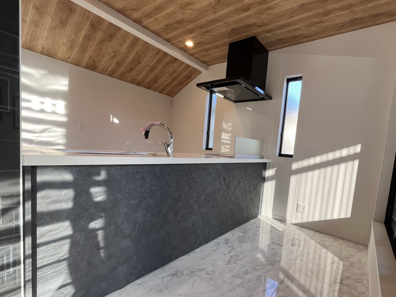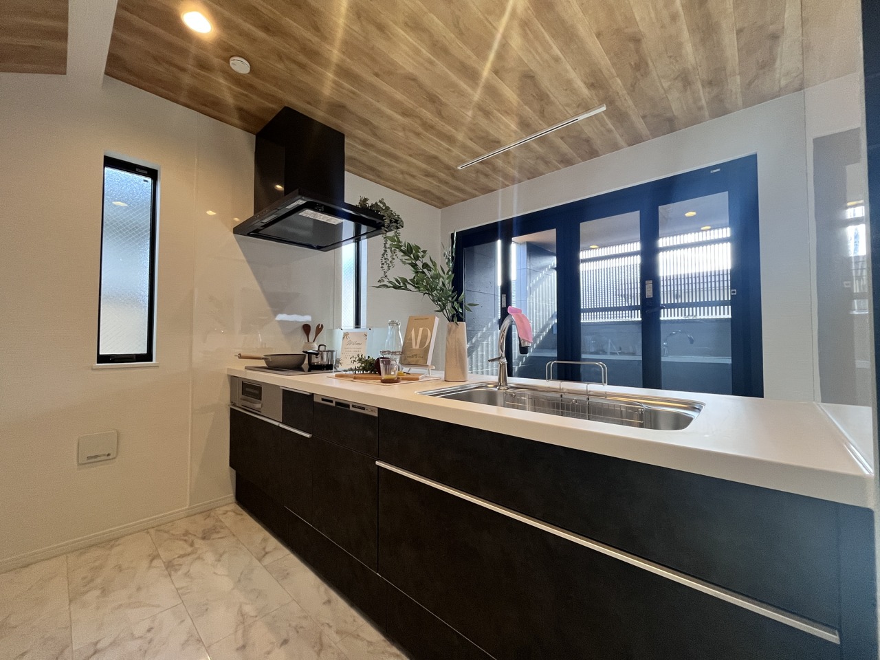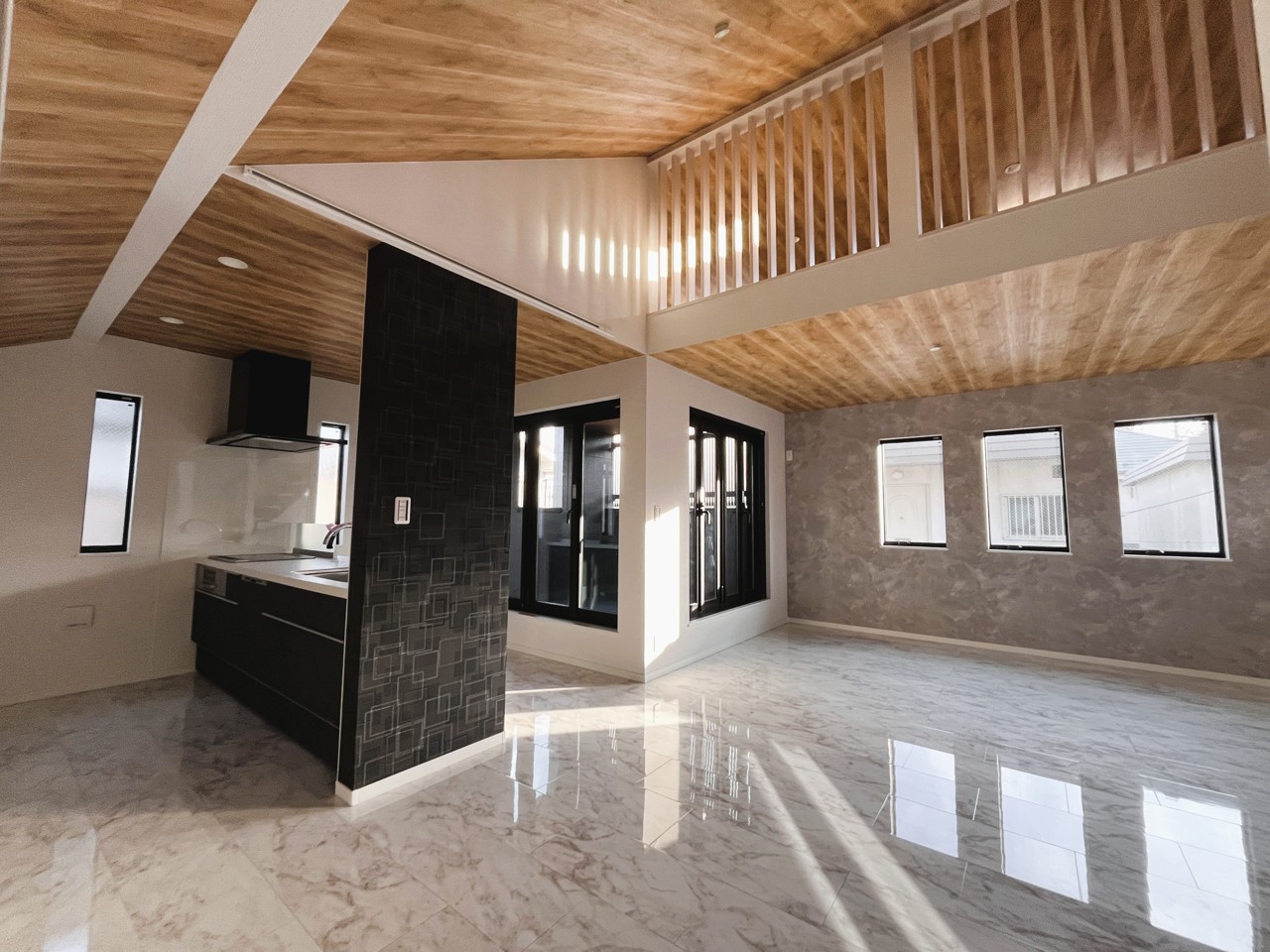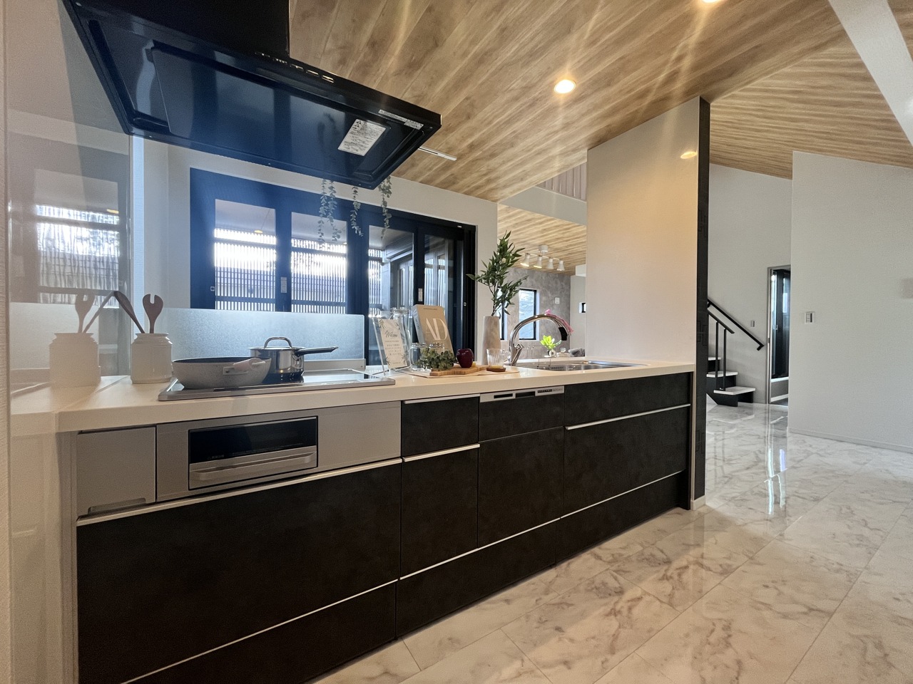 温かみある木目天井と、洗練されたキッチン空間の調和