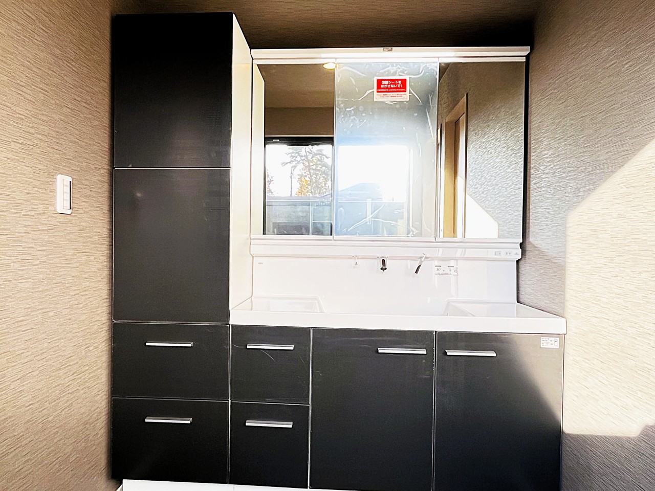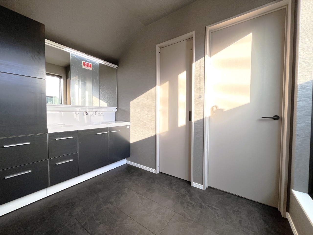 ワイドの3面鏡と豊富な収納のある洗面脱衣室。ゆとりの洗面スペースで朝の身支度もスムーズに行えます。