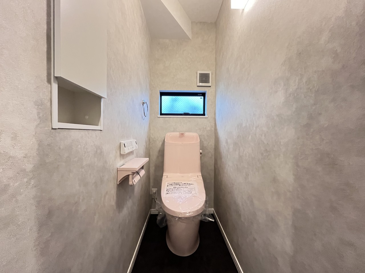 ウォシュレット機能付きの1階トイレ。換気のしやすい窓付きで、収納もあり実用性も兼ね備えた造り。