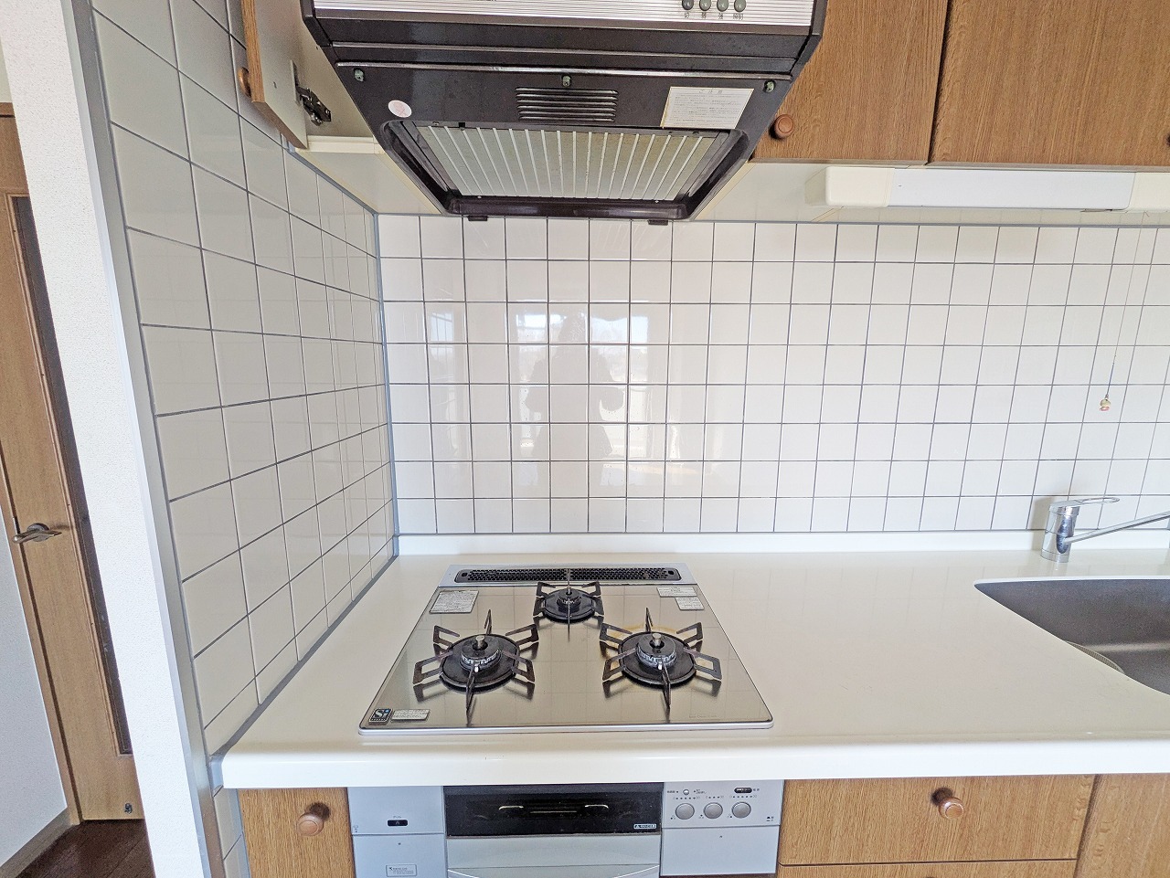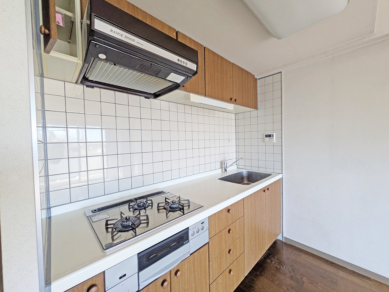 手を伸ばせばそこに収納が。安定した使用感の吊戸棚つきのキッチン空間。
