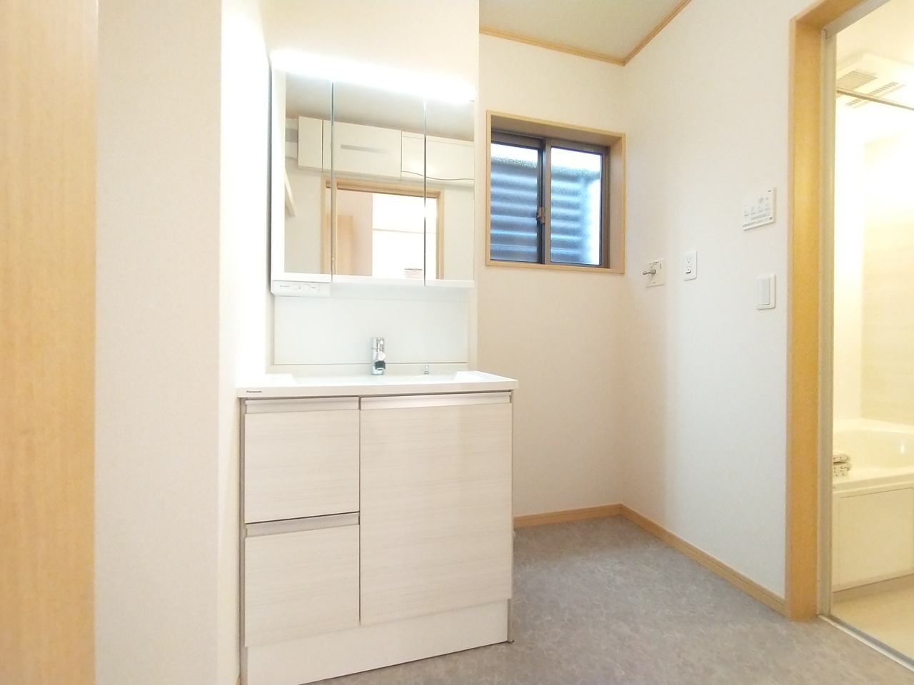化粧台はやっぱり色が一番。シャワーヘッド付きの収納充実タイプです。
