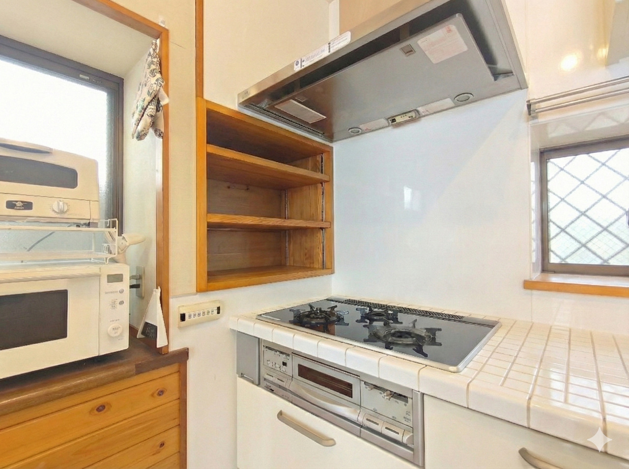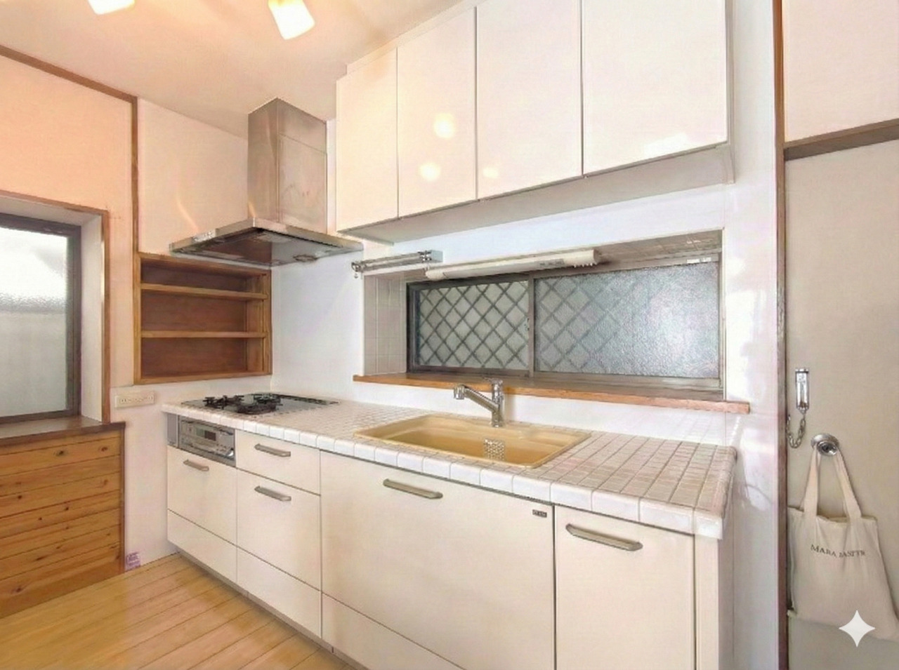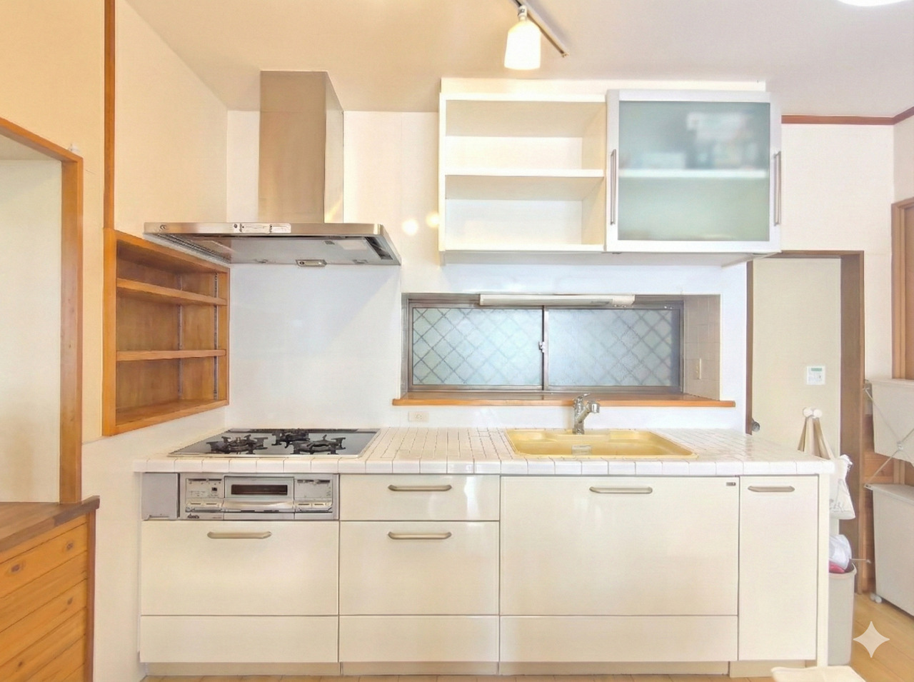 壁付けのシステムキッチン。 吊戸棚収納も備え付けられており、収納力を兼ね備えたキッチンです。