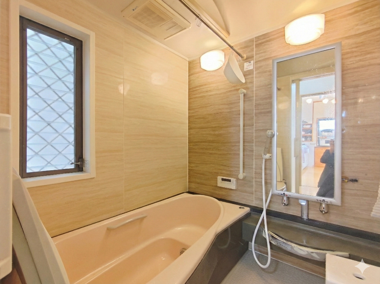 ゆったりと足を伸ばせる1坪サイズのバスルーム。 便利な浴室暖房乾燥機付きです。