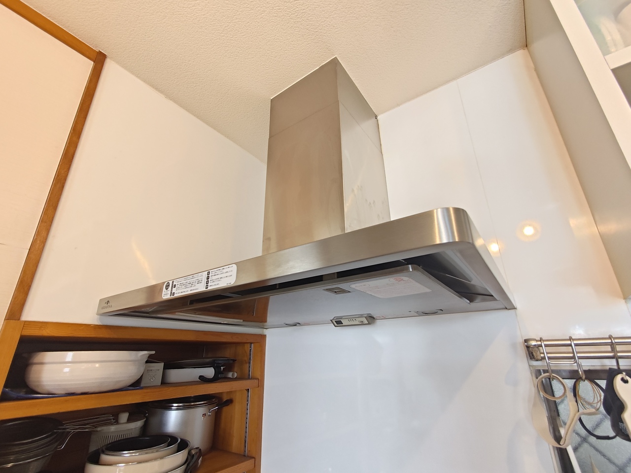 スマートな見た目のレンジフード。 場合に応じて換気速度が調節できます。