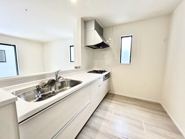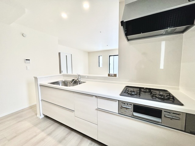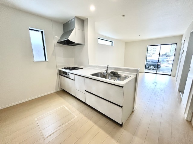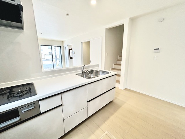 A号棟 リビングにいる家族の顔が見渡せるカウンターキッチン。お料理もより一層おいしく、楽しく。食器棚を背面に設置しても十分な広さを確保しています。 2026/02/08m