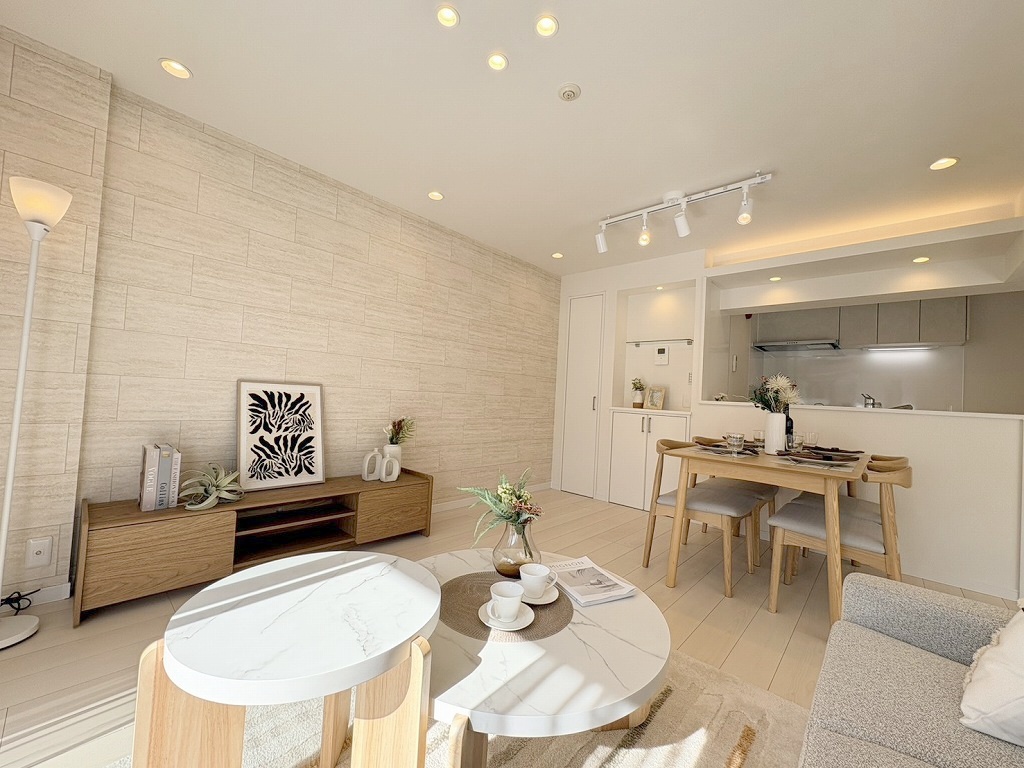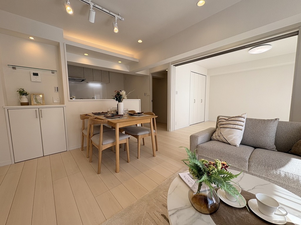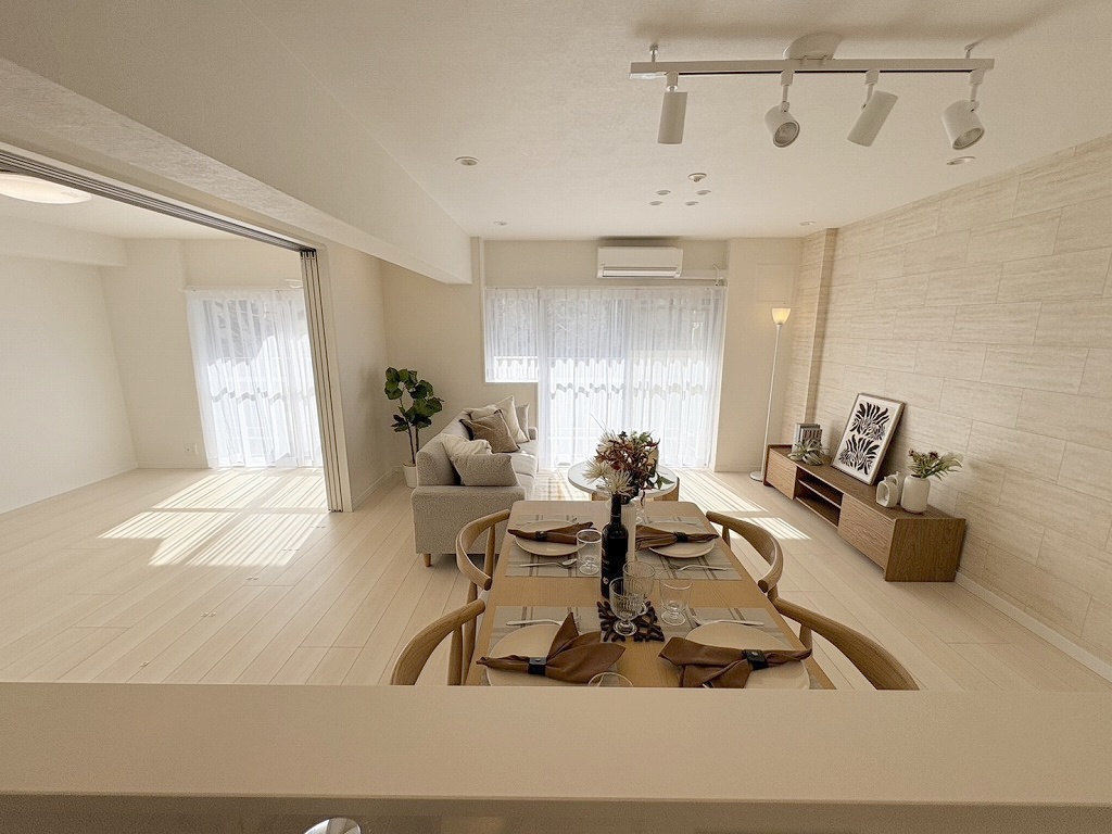ゆとりのあるサイズのリビングダイニング。 お食事スペースと、お寛ぎ空間を分けてご利用可能。 少し大きめのソファーを置いて、 一家団欒なお時間をご共有ください。