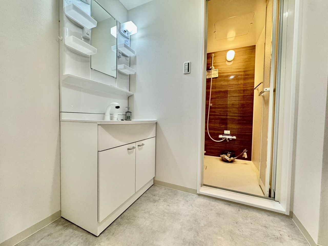 ワイドなボウルにハンドシャワー水栓が付いた洗面化粧台。