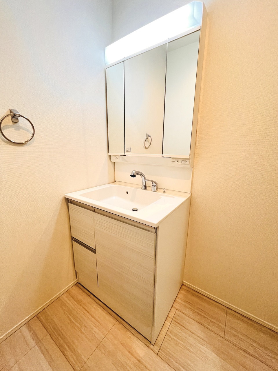 三面鏡に洗面台。 コンセントに照明機能、多機能性を備えた設備です。