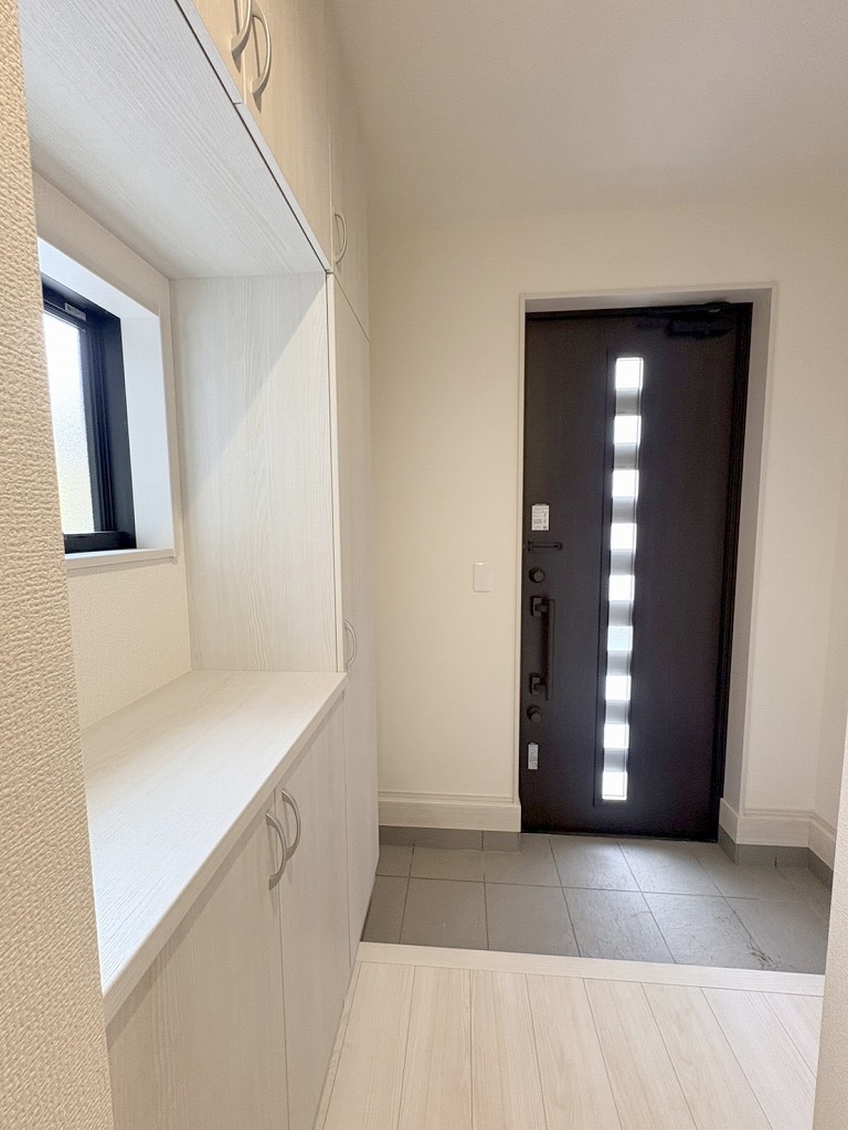 玄関は家の第一印象を左右する重要な場所。ほどよい広さとスタイリッシュな色遣いが印象的です。