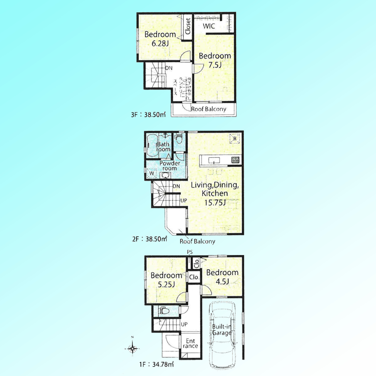 | 建物面積 | 110.99m² ~ 111.78m² 実測 (車庫部分約12.42平米、玄関ポーチ一部約3.1平米含む) | ||