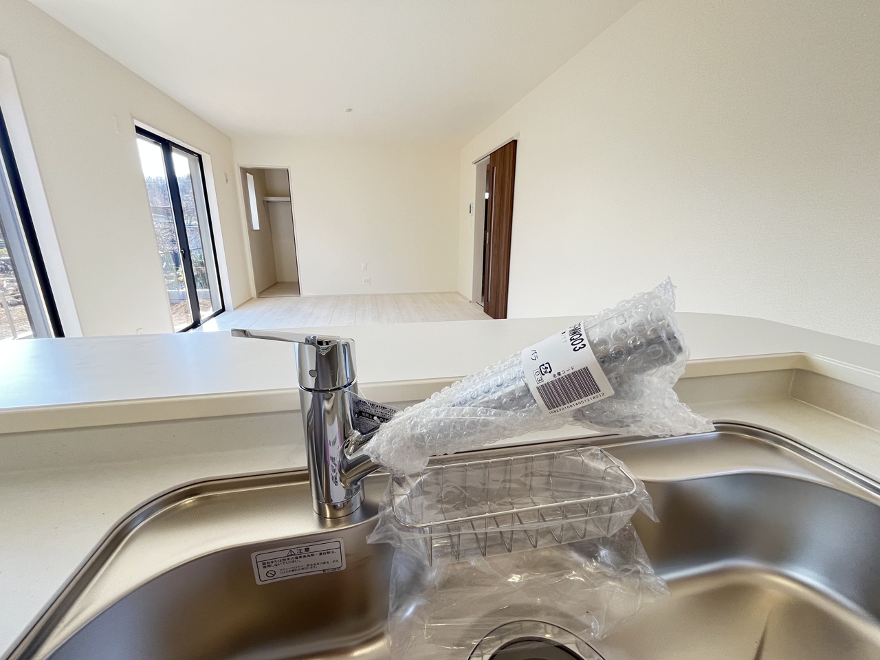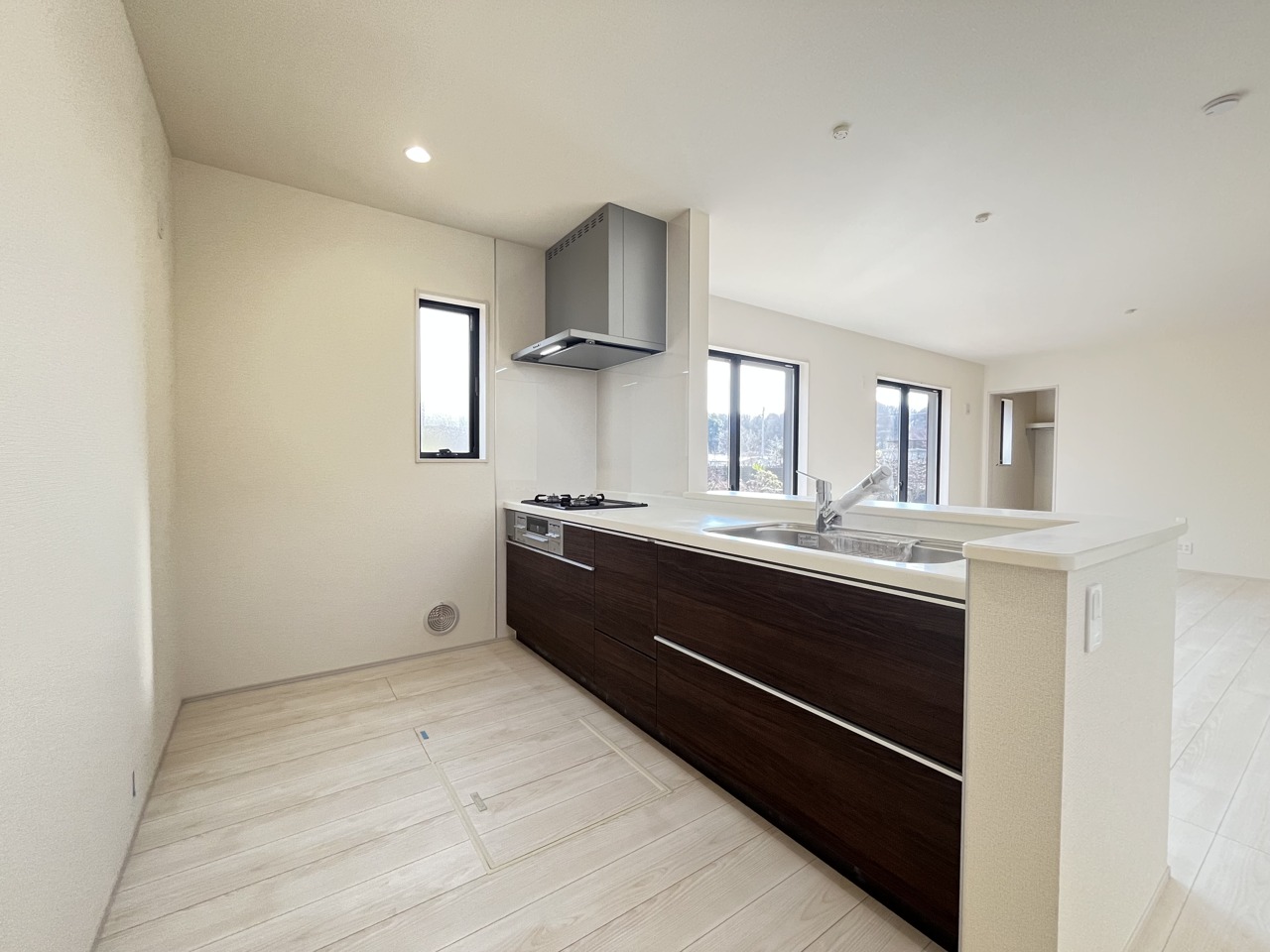 リビングにいる家族の顔が見渡せるカウンターキッチン。お料理もより一層おいしく、楽しく。食器棚を背面に設置しても十分な広さを確保しています。