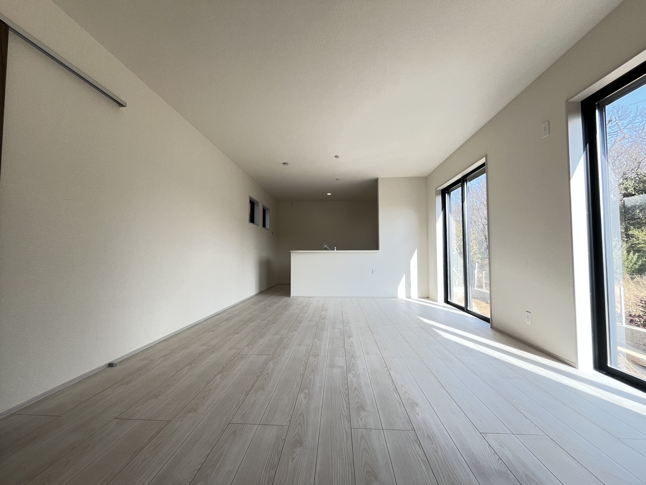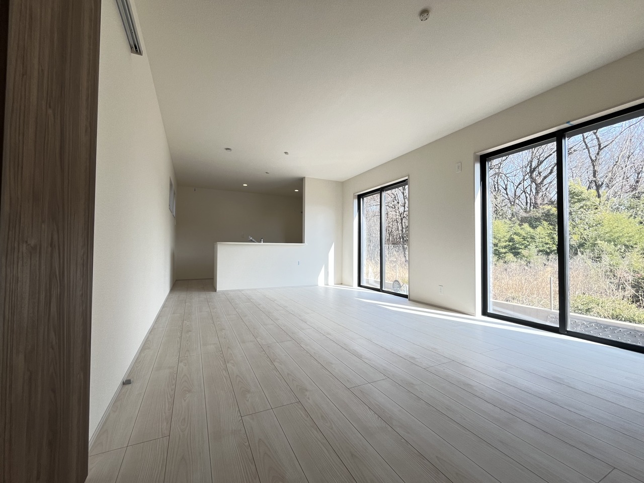家族や友人、両親、親戚とこれから沢山の時間を紡ぐのだろう。そこを彩るのは窓から見える青い空、心地よい緑。そんなイメージが膨らむリビングスペース。