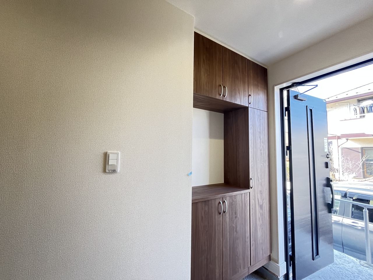 明るく開放的な玄関、靴の脱ぎ履きもしやすく、収納も豊富でご家族皆様の靴をスッキリ収納できます。