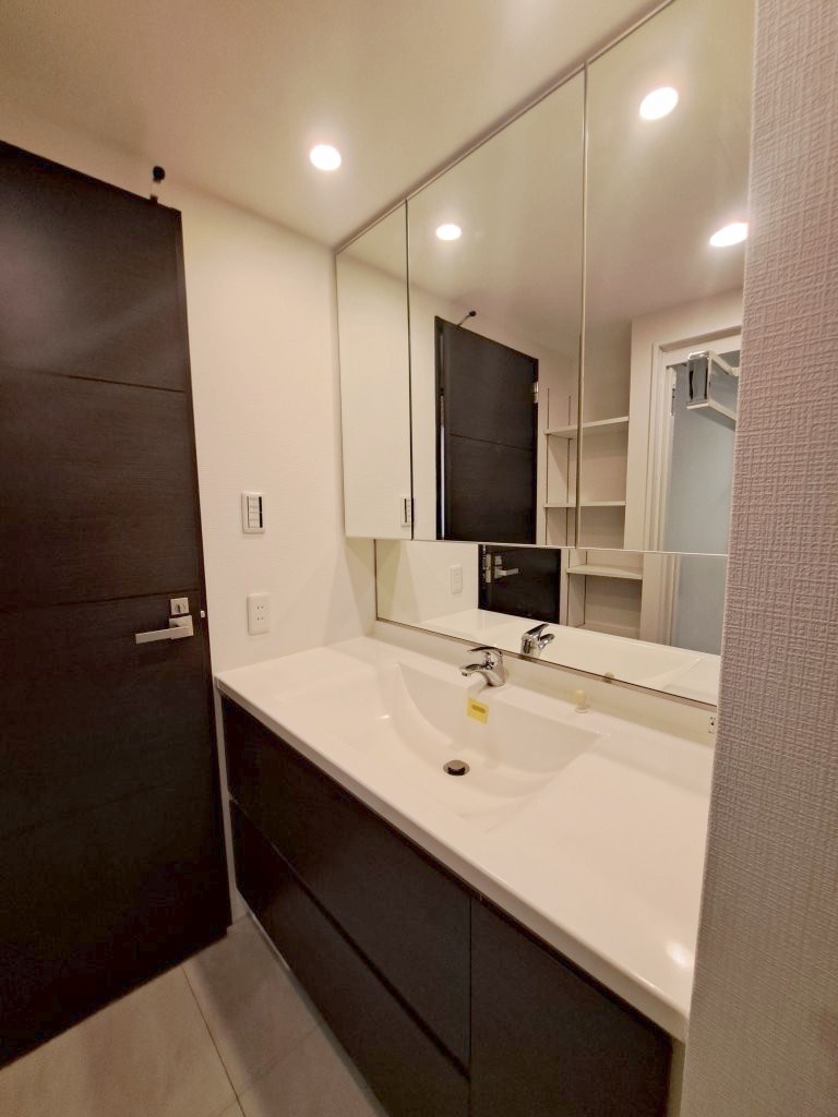 三面鏡に洗面台。 コンセントに照明機能、多機能性を備えた設備です。