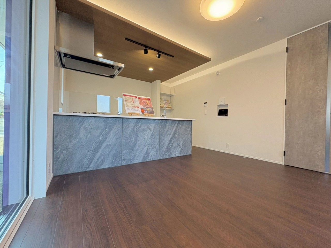カウンターキッチンは、キッチン側とリビング側に分かれてお店間隔でのお食事も可能!! お休みの日には、いろいろな楽しみ方を家族みんなでお楽しみください