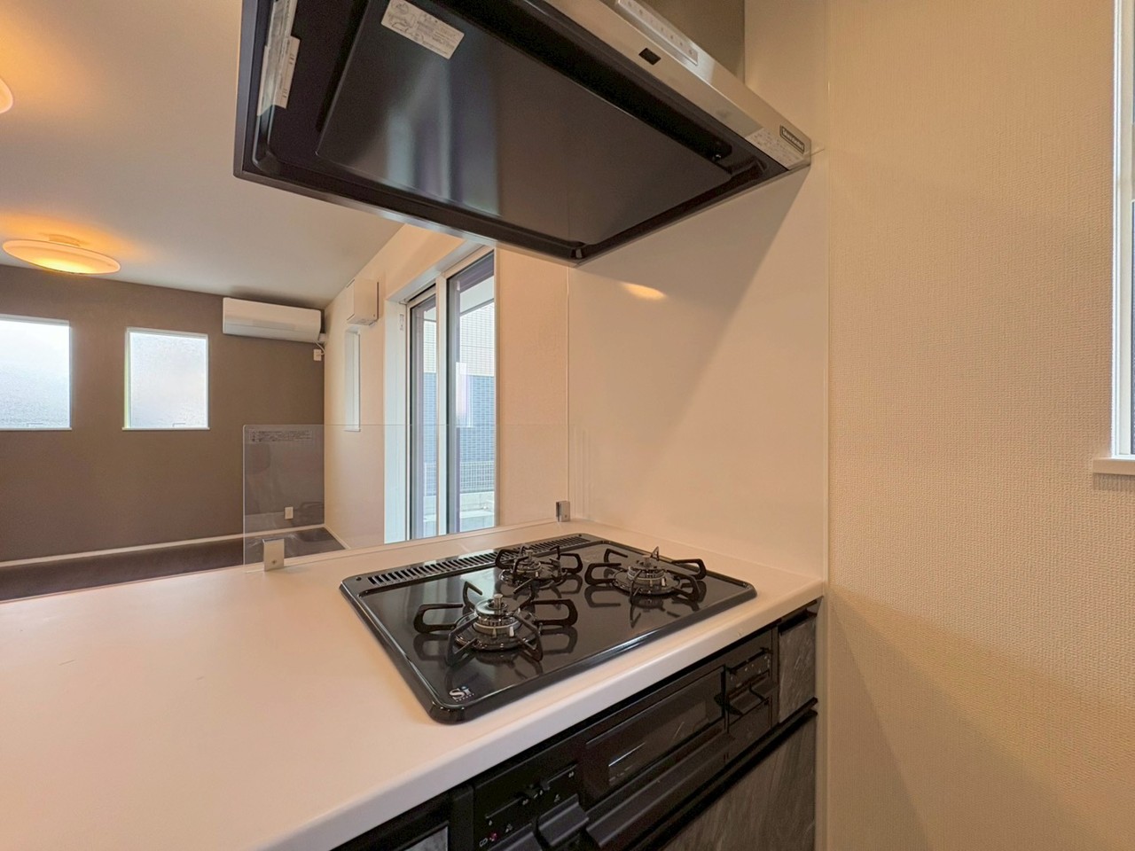 キッチンコンロスペースの近くには、空気の入れ替えが可能な開口部を設置!! お料理をする際には、換気扇を回しながら匂いが籠らない様に開放してお料理もお楽しみ頂けます。