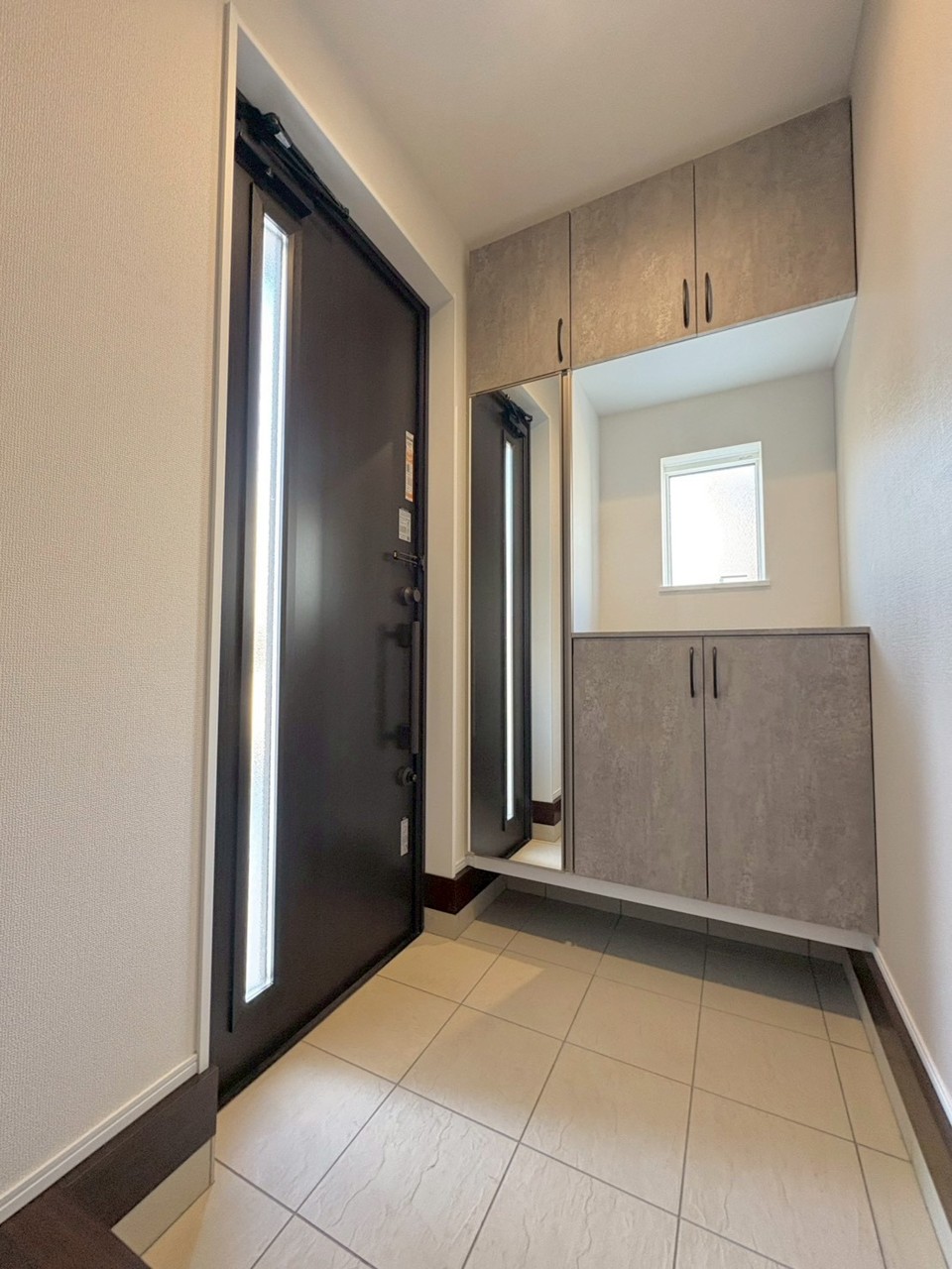 玄関は家の第一印象を左右する重要な場所。ほどよい広さとスタイリッシュな色遣いが印象的です。