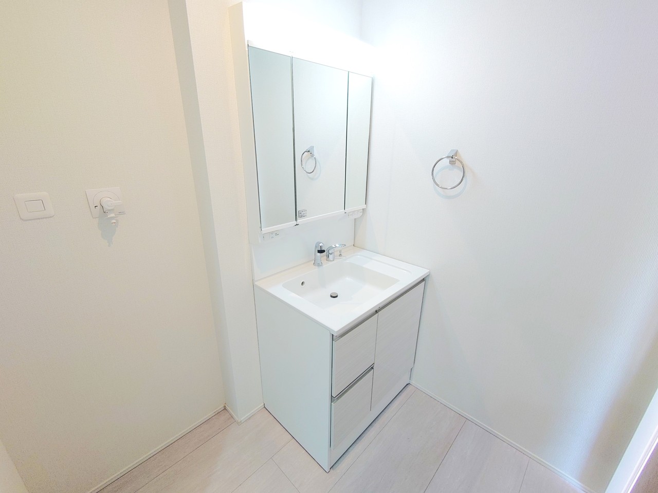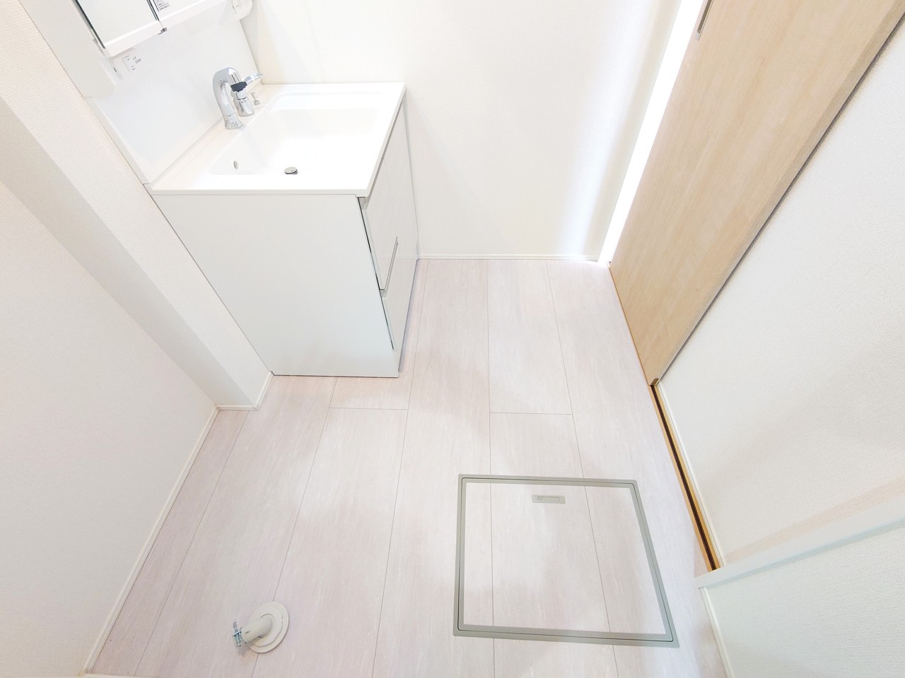 洗面化粧台は清潔感の漂うホワイトをベースカラーに、シンプルなデザインで。