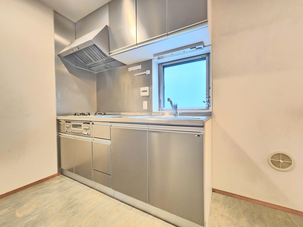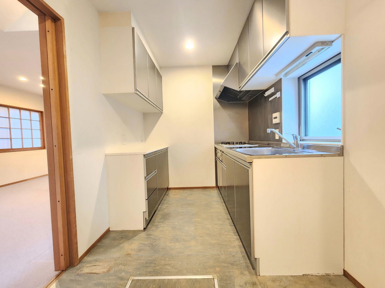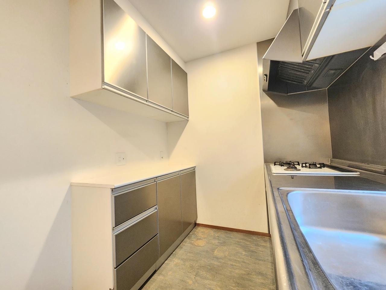 手を伸ばせばそこに収納が。安定した使用感の吊戸棚つきのキッチン空間。