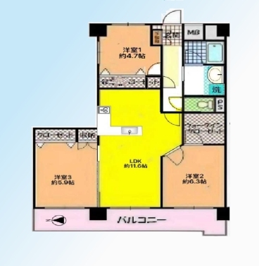| 間取 | 3LDK (LDK11.6帖、洋室4.7帖、洋室6.3帖、洋室5.9帖) | ||