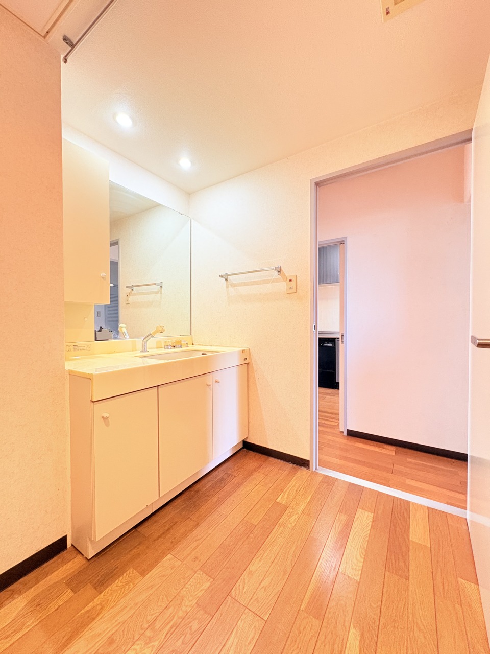 マンションならではの広く、鏡の大きな洗面化粧台。