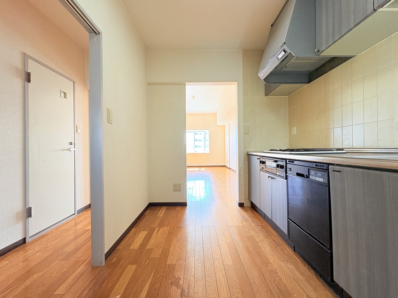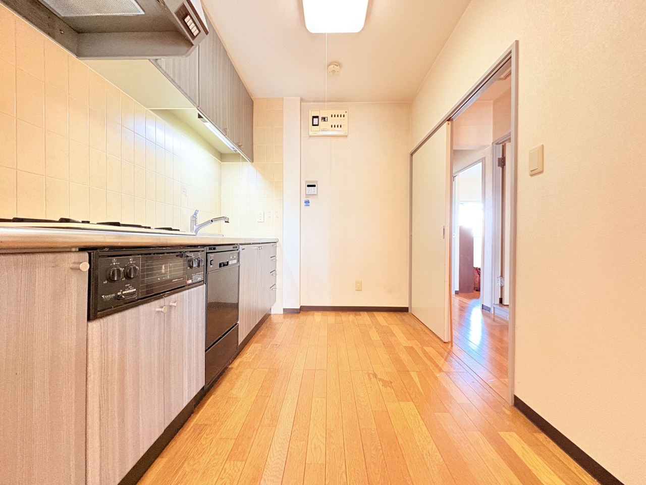手を伸ばせばそこに収納が。安定した使用感の吊戸棚つきのキッチン空間。
