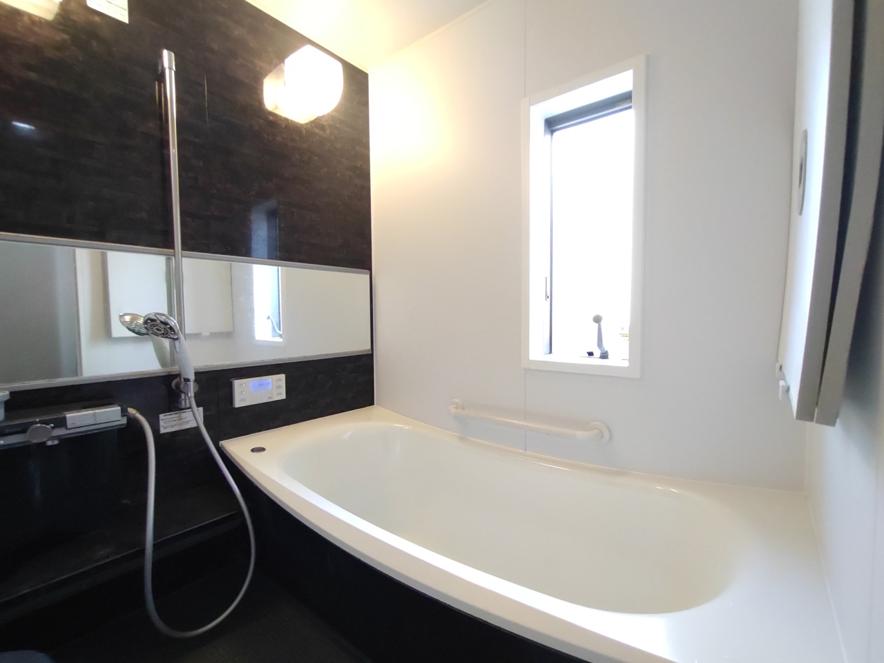ブラック系のアクセントパネルを使用したスタイリッシュなバスルーム