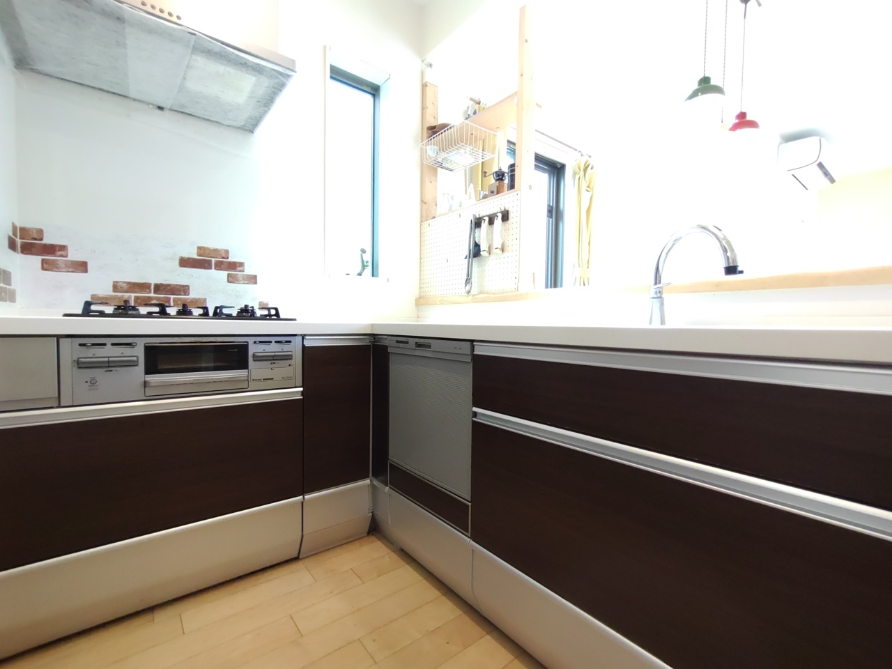 使いやすいL字型のシステムキッチンは、足元まで収納たっぷりです