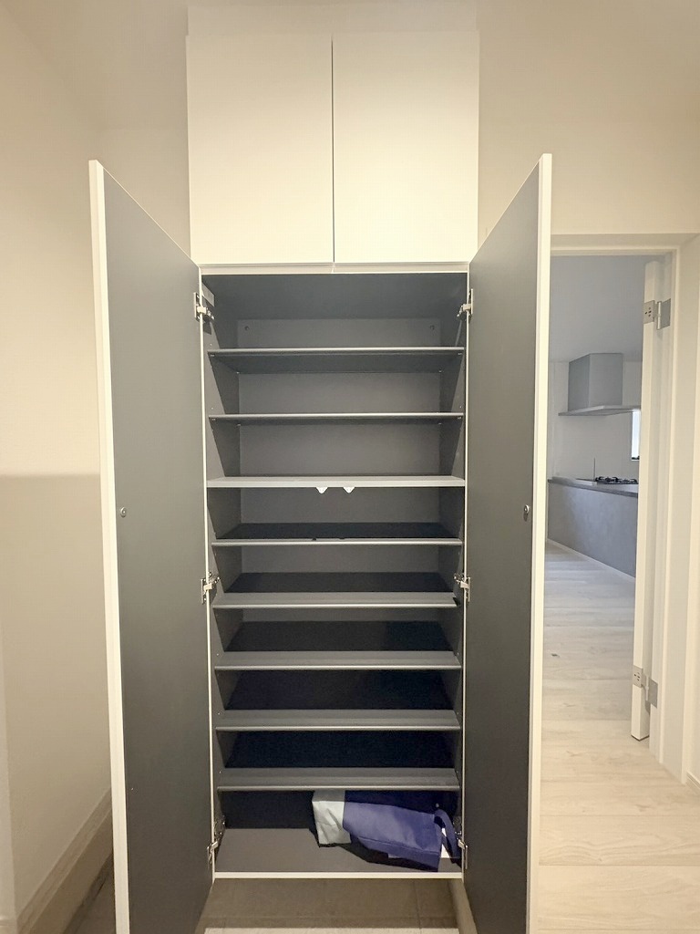 靴が沢山ある方には嬉しいシューズクローク。ベビーカーやゴルフバッグなども置けそうなスペースに