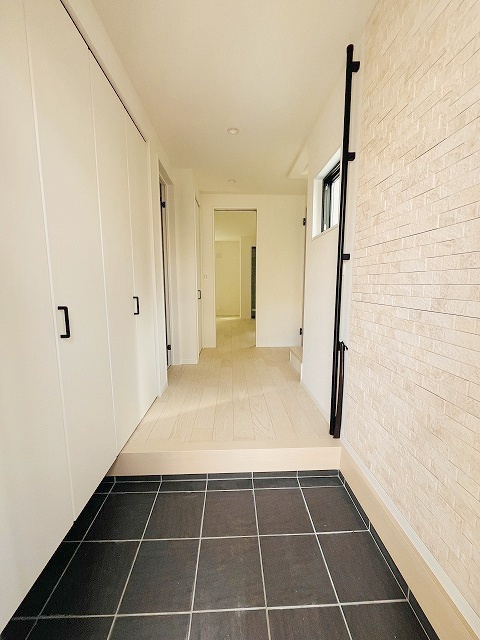 玄関は家の第一印象を左右する重要な場所。ほどよい広さとスタイリッシュな色遣いが印象的です。