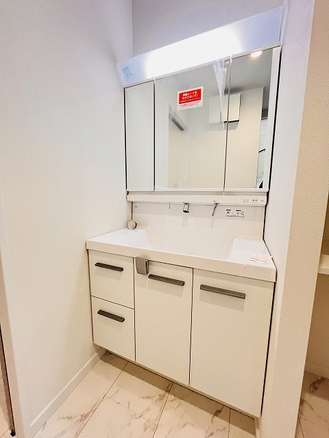 三面鏡に洗面台。 コンセントに照明機能、多機能性を備えた設備です。