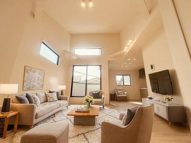 吹抜けの空間を意識した開放感のあるリビング。