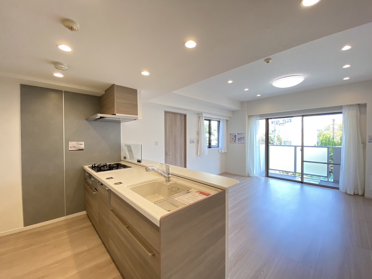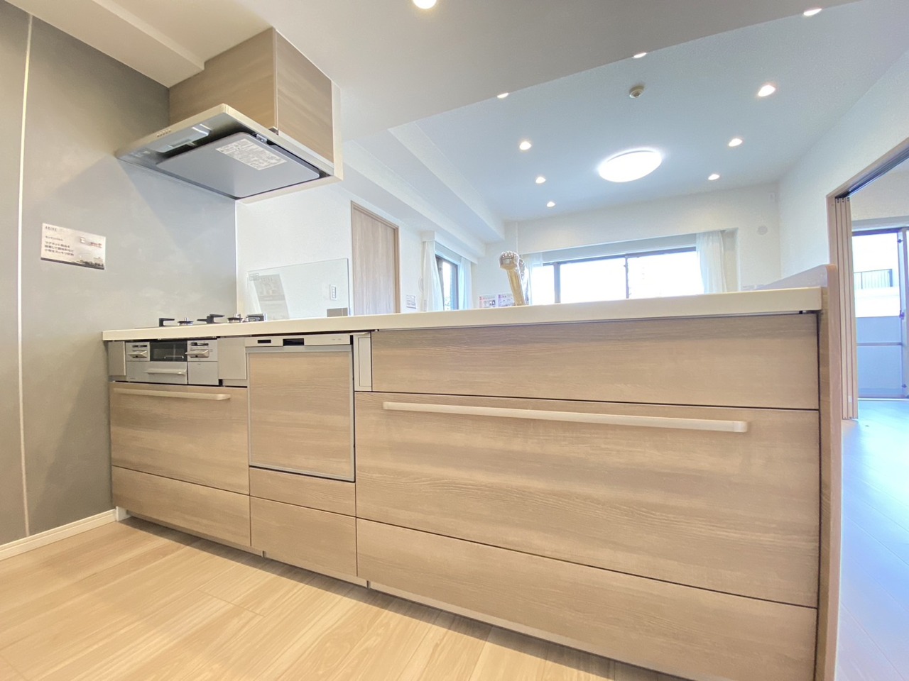 吊戸棚で視界を遮らず、パノラマ感を重視したタイプのキッチンスペース。