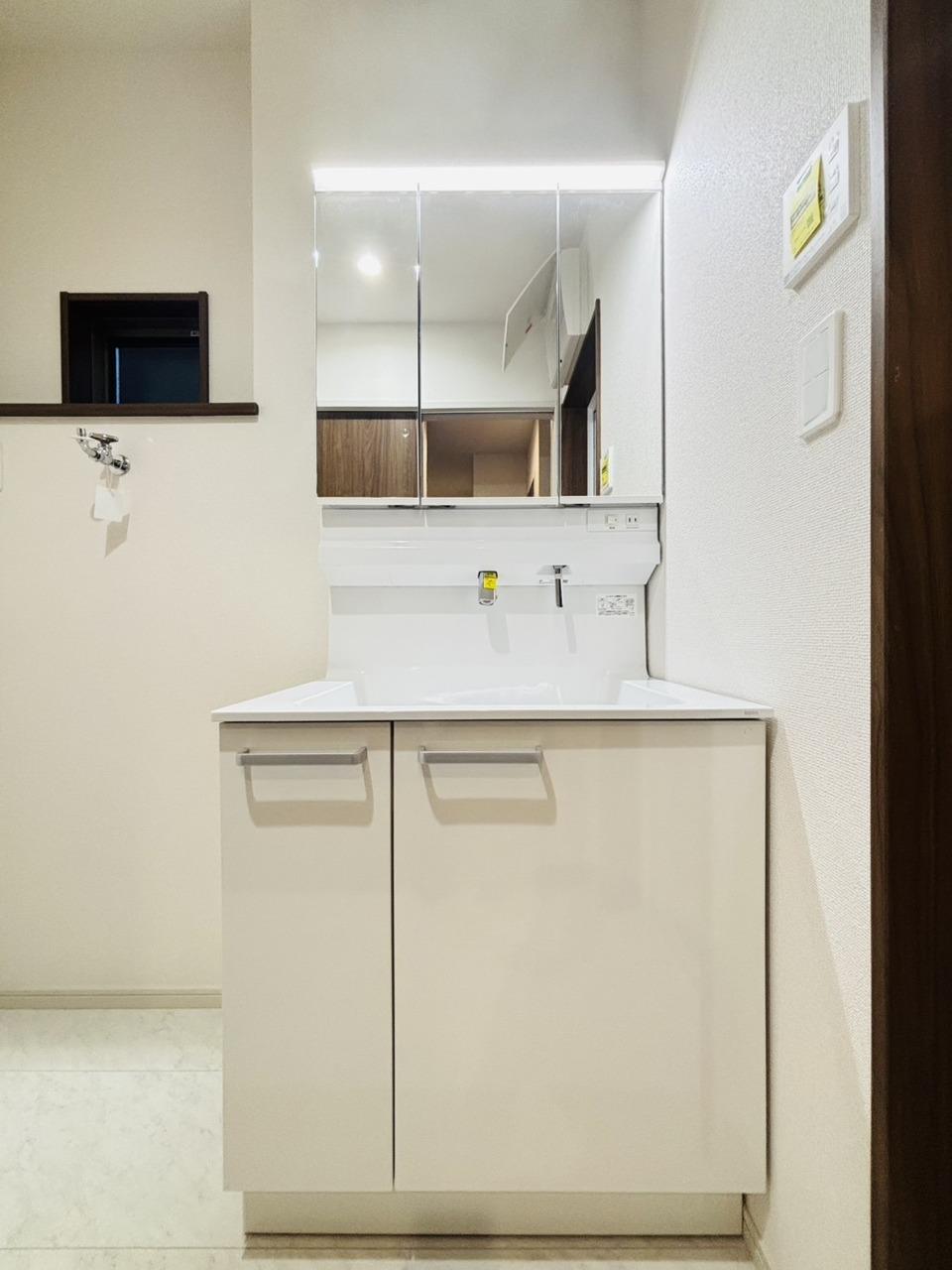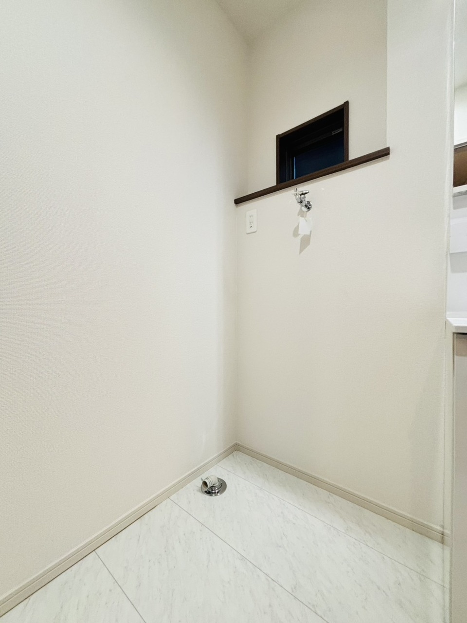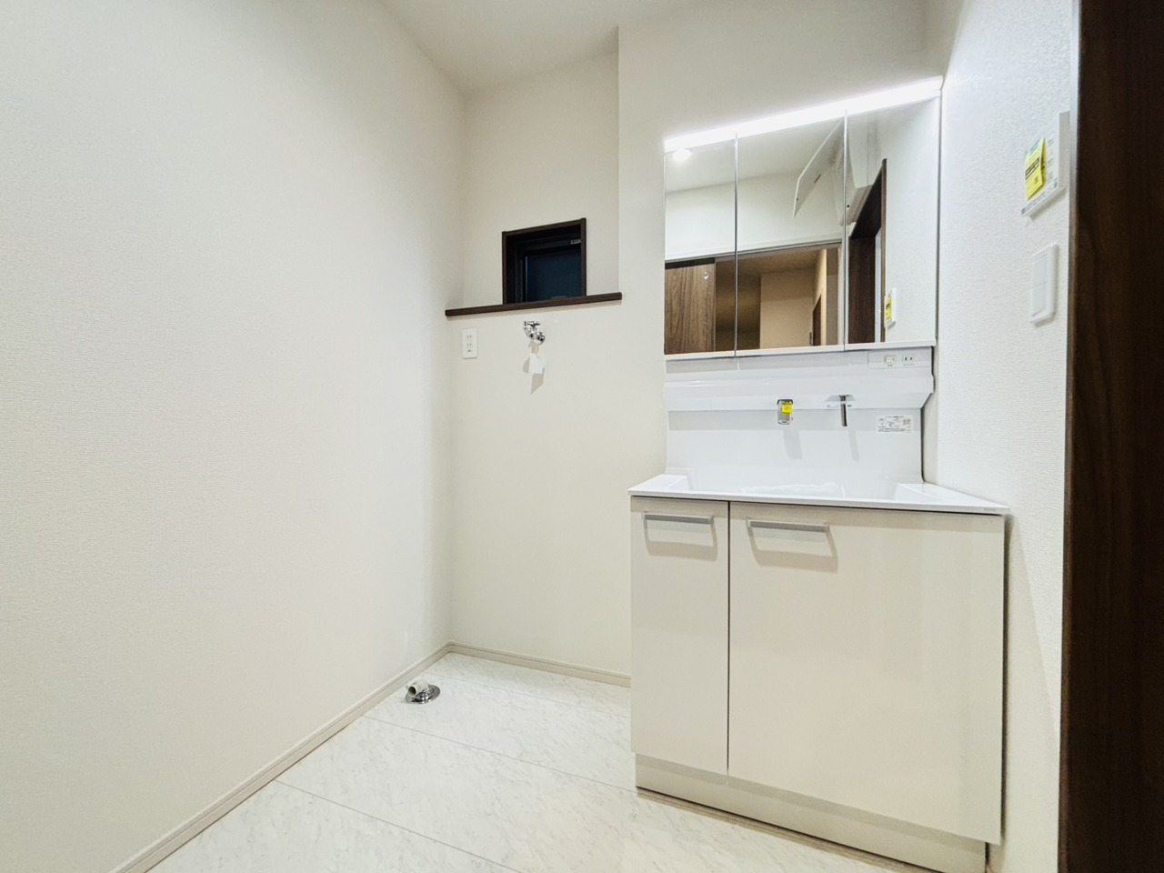 洗面台横にランドリーコーナーもゆったり。ドラム式洗濯機も置けそう。
