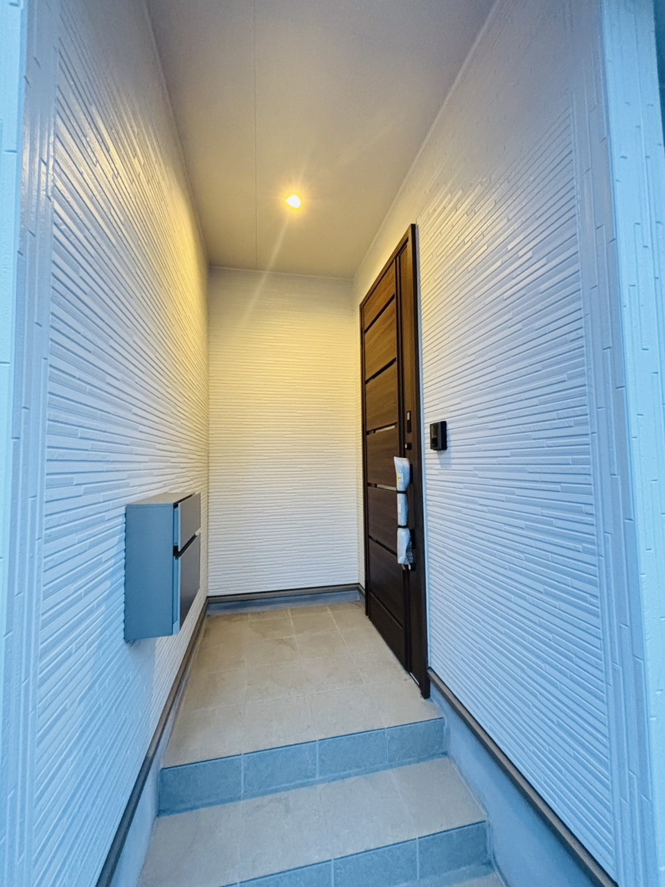 ポーチのついた新築分譲物件。玄関の印象はいかがでしょうか?入口からご覧ください。