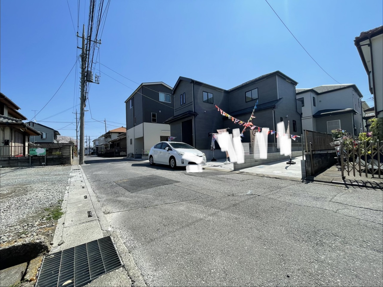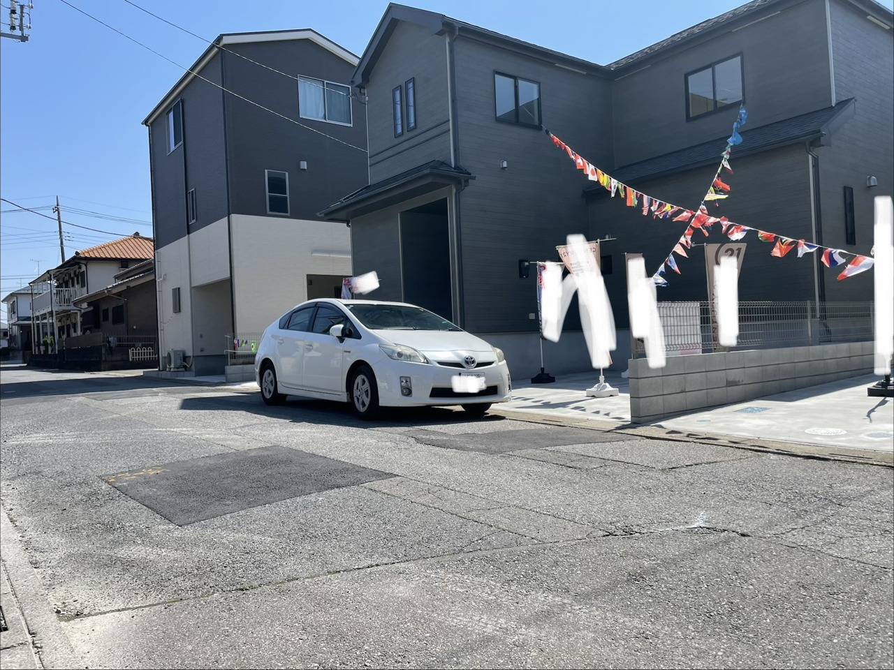 青空の下、モダンな外観と彩り豊かなガーランドが調和する住まい