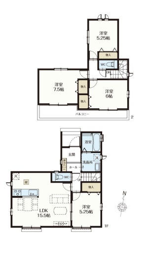 | 間取 | 4LDK (LDK15.5帖、洋室7.5帖、洋室6帖、洋室5.25帖、洋室5.25帖) | ||