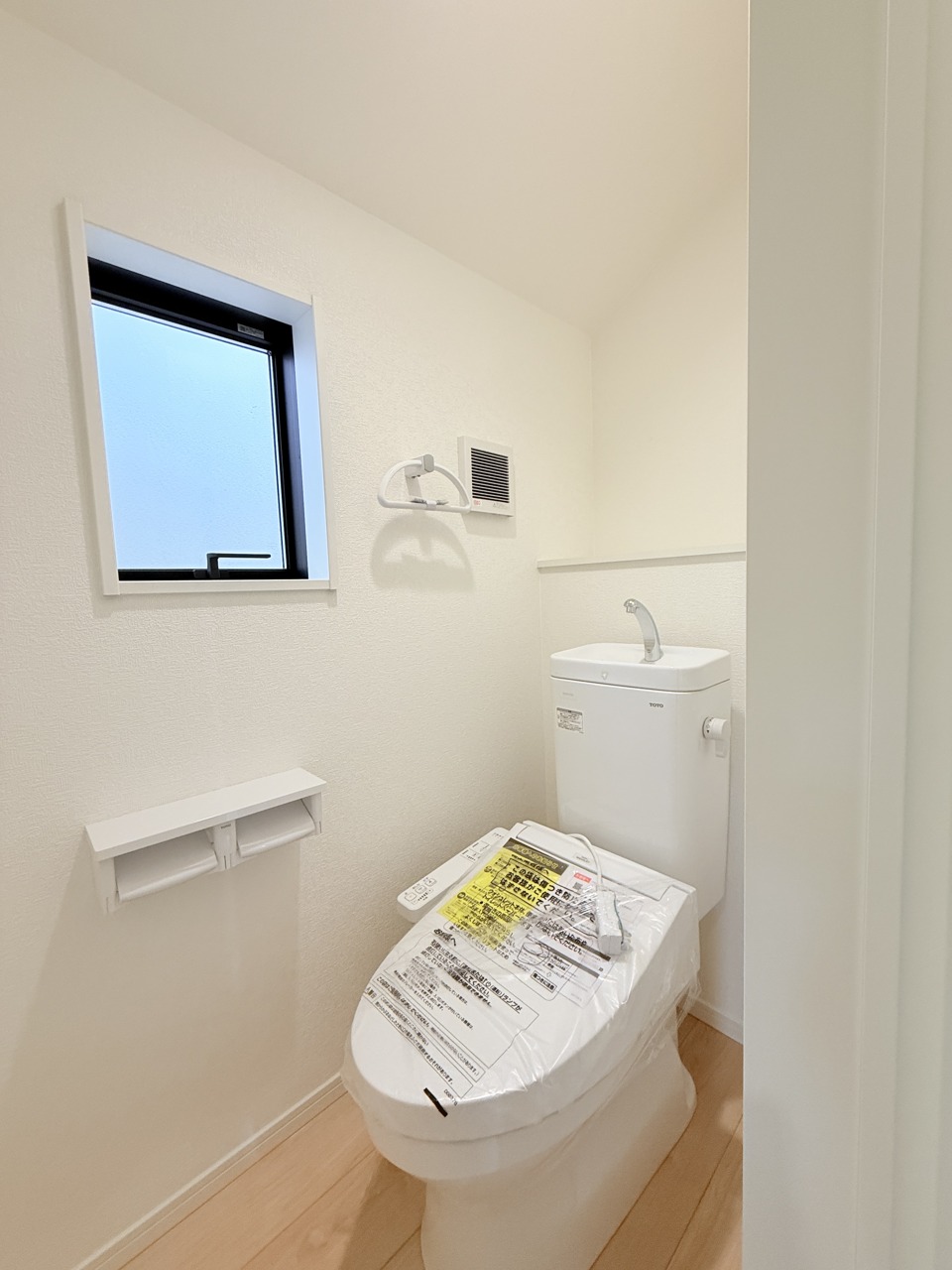 ウォシュレット機能付きのトイレ。換気のしやすい窓付きで、収納もあり実用性も兼ね備えた造り。