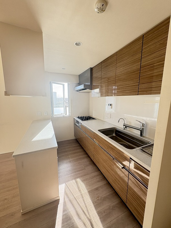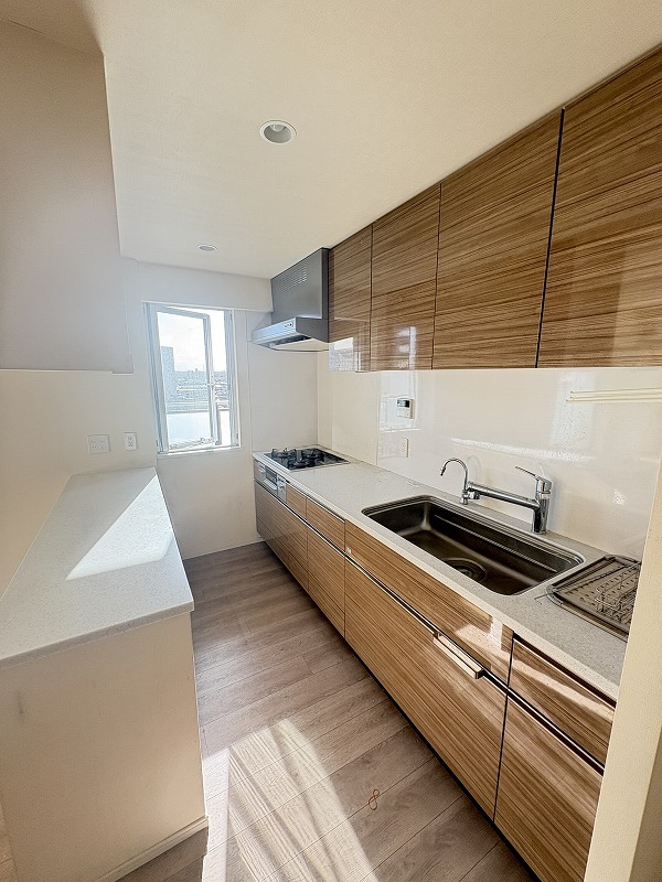 南西側の窓からたくさんの光が差し込みキッチンスペース。 キッチン後部には食器などが収納できるカップボード付きです。