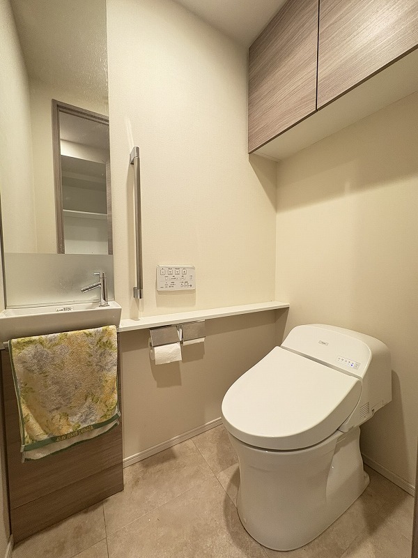 ウォシュレット機能付きのトイレ。収納、手洗いもあり実用性も兼ね備えた造り。